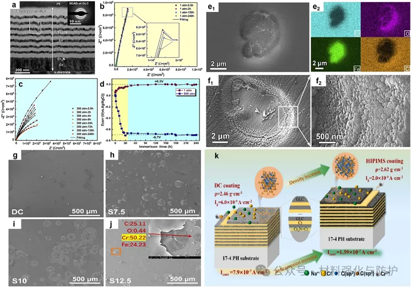 类石墨碳(GLC)涂层等通过多层结构设计可以减少缺陷,通过高功率脉冲磁控溅射方法制备的Cr/GLC涂层往往密度更高,其在15MPa静水压下耐腐蚀性优于直流溅射制备的涂层。