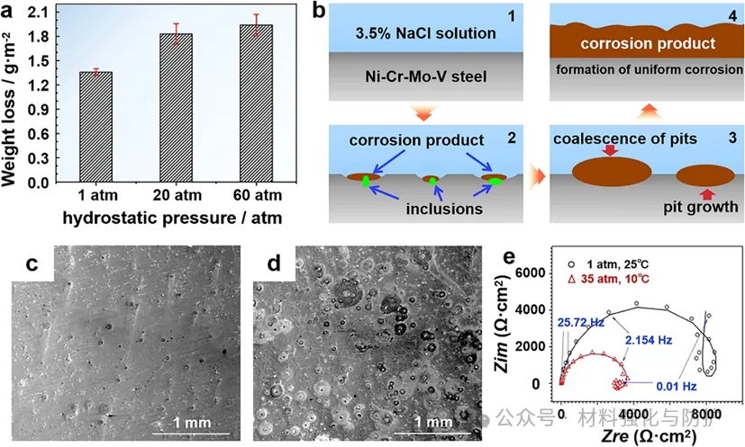 (a)Ni-Cr-Mo-V高强度钢在不同静水压力下3.5%NaCl溶液中浸泡10 h后的失重、(b)Ni-Cr-Mo-V高强度钢在高静水压力下的腐蚀模型示意图,(c)模拟浅水环境和(d)深水环境中在人工海水中浸泡30分钟后,Al-Zn-In-Mg-Ti合金腐蚀表面的SEM图像,(e)Al-Zn-In-Mg-Ti合金在两种环境中的Nyquist图