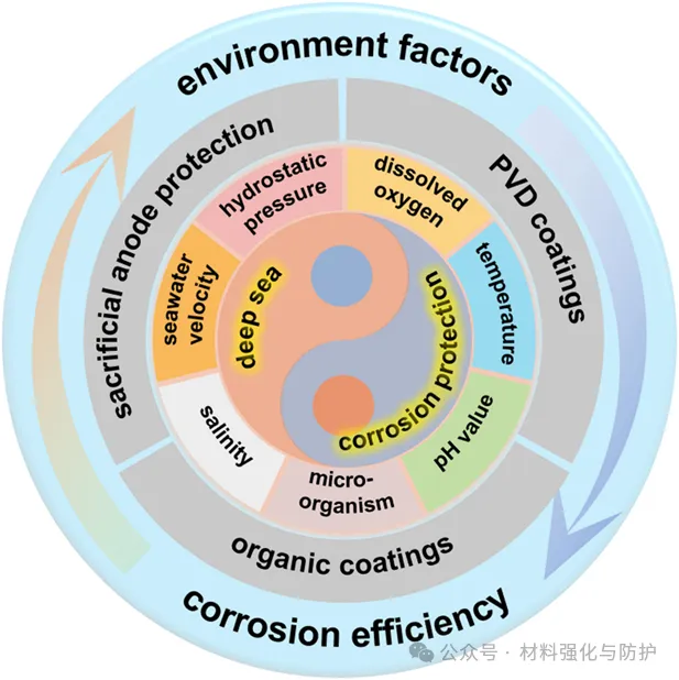 与浅海环境相比,深海在静水压力、溶解氧、温度、pH值、海水流速以及微生物等方面都呈现出明显不同的环境特征。这些因素随海水的面积和深度而变化,并具有独特的特征。材料的保护和失效性能与这些因素密切相关,其在深海环境中的腐蚀机理与浅水环境中的腐蚀机理可能有显著不同。