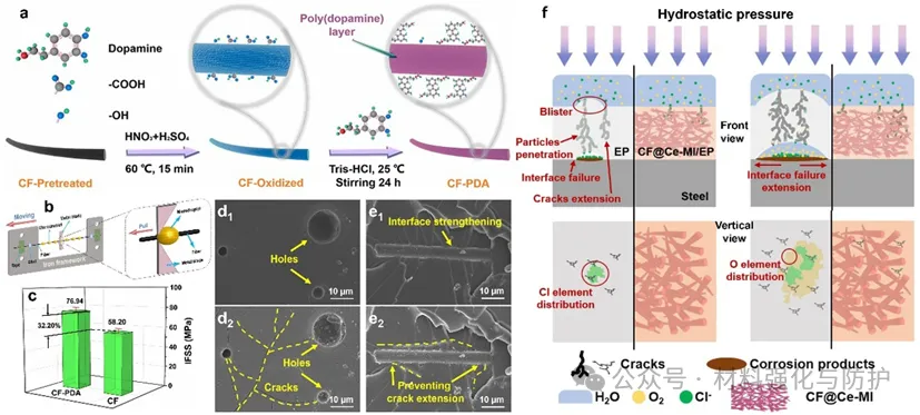 (a)CF-PDA 合成过程示意图、(b)单纤维微粘结试验示意图和(c)环氧微滴/单丝样品的IFSS值、30MPa环境浸泡120 h前后(d)纯EP和(e)CF-PDA/EP的断裂形貌以及(f)AHP中的相关保护机制