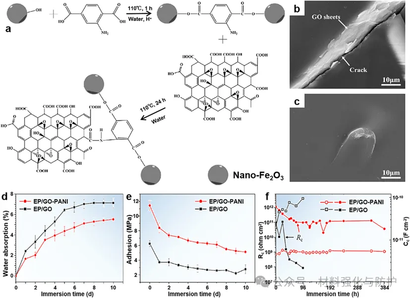 (a)Fe2O3@GO的详细合成示意图,(b)GO/EP涂层和(c)纳米Fe2O3@GO/EP涂层在(d)3.5 wt.% NaCl 3.5 MPa AHP条件下样品的吸水率和(e)附着力随浸泡时间的变化,(f)AHP中涂层电容和电阻随浸泡时间的变化