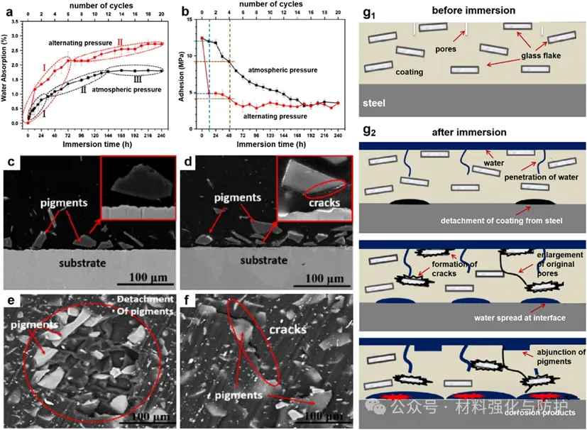 (a)在大气压力和AHP中游离膜样品的吸水曲线,(b)在大气压力和AHP中涂层/钢样品随浸泡时间的附着力测试结果,在AHP中环氧玻璃鳞片涂层的SEM微观形态,浸泡240 h(c)之前和(d)之后的截面形态,(e)浸渍240小时后的表面形态,(f)浸渍240小时后的表面形态以及(g)相关的腐蚀失效过程