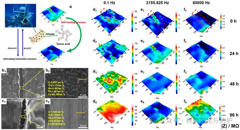 利用有机材料的化学稳定性和物理屏障作用可以隔离腐蚀介质,玻璃鳞片、云母等传统填料能够增强涂层性能,但在高静水压下易因水吸收加速失效,石墨烯、MXenes等2D纳米片可以通过优化分散和界面结合而显著提升涂层耐腐蚀性。另外,GSLNTA涂层等部分涂层还具有自修复功能,对金属深海防护具有重要的作用。
