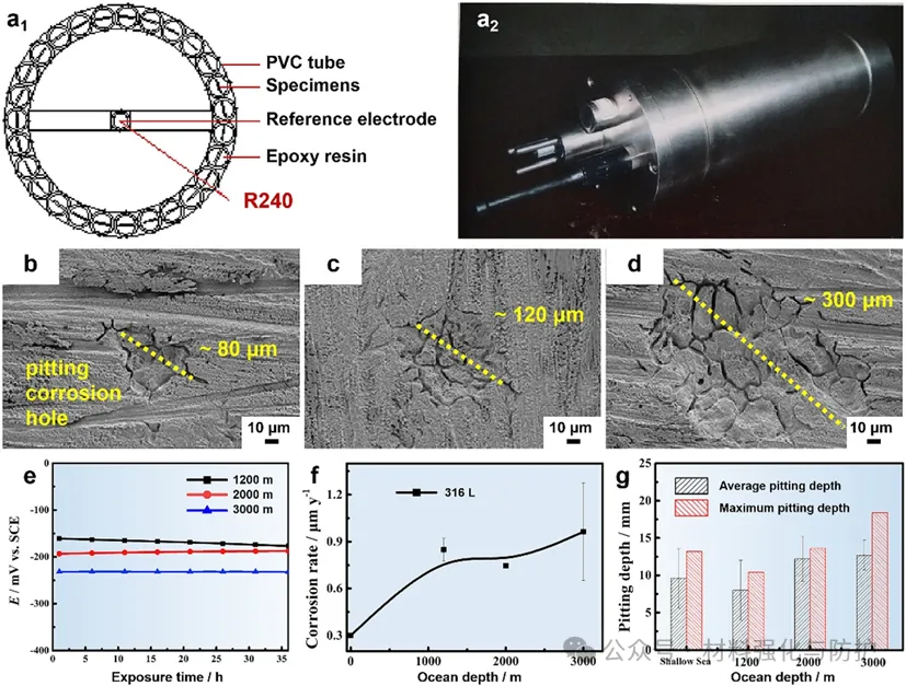 (a1)电极封装和(a2)原位OCP测试设备,(b)除锈1200m、(c)2000m和(d)3000 m后316L不锈钢的SEM图,(e)在初始场暴露阶段期间暴露于不同深度的316L试样的OCP变化,(f)316 L暴露一年后平均腐蚀速率随海洋深度的变化和(g)不同海洋深度点蚀平均深度和最大深度的比较