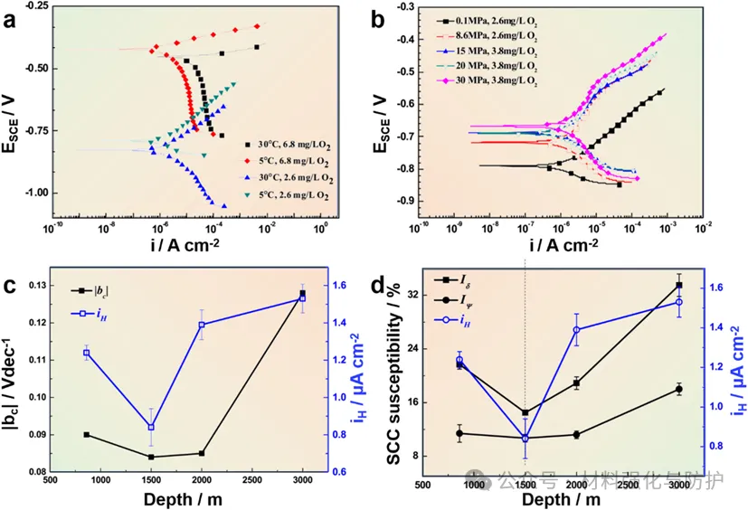 X70钢在3.5wt.%在0.1 MPa的NaCl溶液中,在(a)不同溶解氧含量和温度以及在(b)5 °C的不同模拟环境下,阴极Tafel斜率的绝对值,(c)X70钢在不同模拟环境中的应力腐蚀敏感性和(d)析氢电流密度的比较