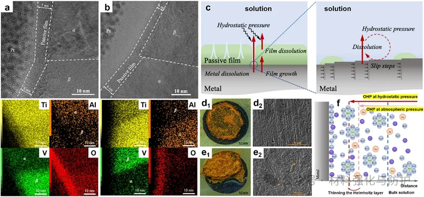 (a)0.1 MPa和(b)20 MPa下Ti-6Al-4 V合金α/ β相界附近的高分辨率透射电子显微镜(HRTEM)亮场图像,(c)20MPa静水压力导致的钝化膜形成示意图,纯铁在3.5%NaCl溶液中浸泡24 h后,在(d)0.1MPa和(e)15MPa下的宏观腐蚀形貌和腐蚀表面除锈情况,(f)静水压力促进金属在NaCl溶液中电化学腐蚀的机理示意图