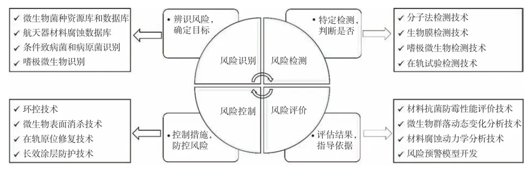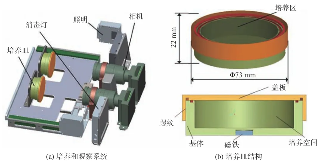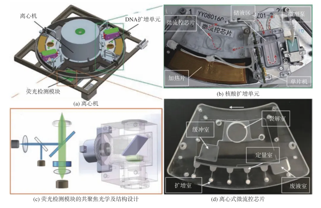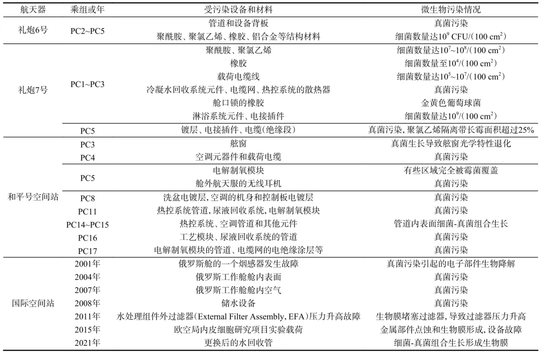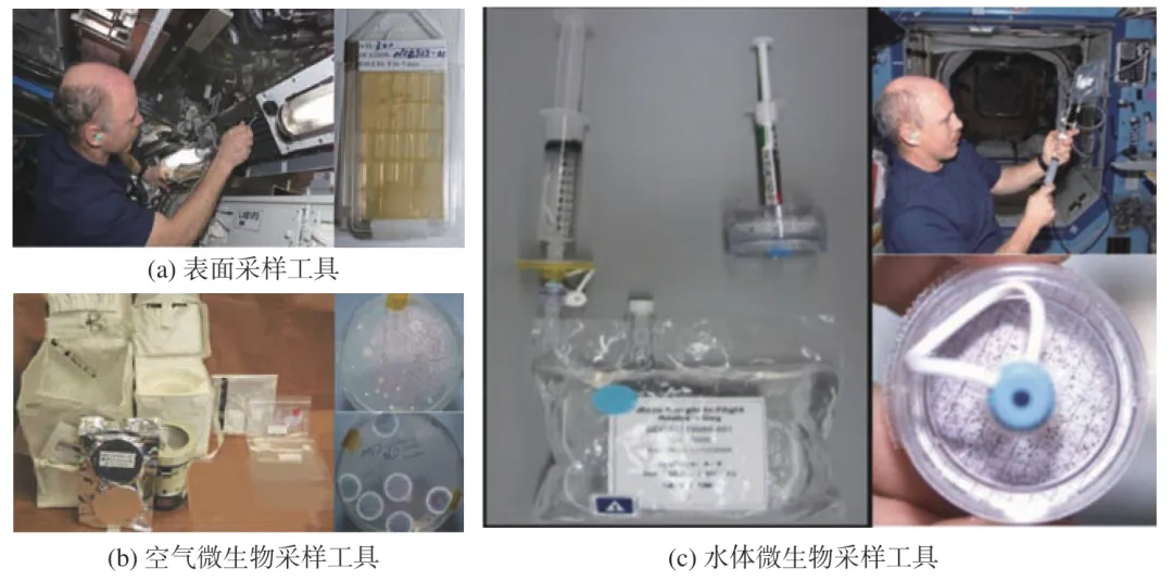 微生物是一类数量繁多、分布广泛且适应性极强的群体,它们可以通过航天员、设备材料、总装测试、货物补给等多种途径进入空间站。空间站作为一个复杂、封闭、相对独立的生态系统,微生物在其中扮演着重要角色,影响着舱内系统的稳定性。一旦微生物失衡,便会引发安全风险。 首先,致病性微生物会对航天员的健康构成威胁,可能导致他们生病或造成感染。在长期飞行条件下,航天员免疫功能可能会受到抑制,而某些致病性微生物的感染毒性可能还会增强,进一步加剧了航天员的健康风险。其次,微生物会破坏舱内设备,表现为微生物腐蚀电缆、接插件、电路板等,造成短路或断路等故障;另外,一些微生物会形成生物膜,堵塞管道,从而引发设备故障。第三,微生物会侵蚀材料,降低材料性能,进而影响空间站的使用寿命。最后,某些微生物还会产生毒素,污染舱内空气、水源和食物,导致舱内环境恶化。 因此,在轨开展空间站微生物防控对于设备在轨长期稳定运行和保障航天员健康具有重要的现实意义。 1 空间站微生物污染影响 从礼炮号到和平号空间站及目前的国际空间站(ISS),都发生过多次微生物污染事件,如表1所示。早期的礼炮号和和平号由于没有微生物防控措施或防控手段不足,发生了10余次微生物污染事件,主要是细菌严重超标和真菌污染。 表1 空间站微生物污染事件 国际空间站已经建立了相对完备的防控措施,但也偶发微生物污染事件,2011年,国际空间站上的水处理组件运行一年后,检测到废水箱电磁阀和过滤器压力升高。经过调查,发现是进口过滤器被真菌和细菌的生物膜堵塞,生物膜积聚在阀门中,阻碍了该区域的阀门间隙,导致过滤器压力升高。2018年,在入口管道和电磁阀上发现了同样的问题,电磁阀的12个通道只有一个没有被生物膜堵塞(如图1所示)。 图1 国际空间站微生物污染事件实例 总结历次微生物污染事件,可以看出以下几个特点: (1)空间站微生物污染组成复杂。细菌超标严重,可达现行标准的10~105倍;真菌污染现象发生更频繁;细菌-真菌组合共生形成生物膜。 (2)污染对象多样。金属和非金属材料均会受到微生物的侵蚀;电缆管道和热控部组件等都易发生微生物污染,特别是在水处理设备中。 (3)微生物污染后果严重。引发材料失效和系统故障;增加管道等复杂结构的维修难度;对舱内环境、设备、人员带来潜在危险隐患。 2 在轨微生物检测 空间站在轨微生物检测技术可分为两种,一种是基于培养法的检测技术,这一技术的优势是传统经典检测方法、体系成熟、易操作,而且可以获得微生物活性菌株,为后续研究工作提供材料。 该方法主要包括中温培养,选择性培养和原位培养。其中,中温培养是在评估微生物水平是否超标时采用的检测方法;选择性培养主要是针对特殊微生物,如耐辐射、耐药性、寡营养等微生物;原位培养主要是针对“未培养”微生物进行检测的技术,如微流控隔离芯片(Ichip)、中空纤维素膜腔(HFMC)、土壤基质膜系统(SSMS)等。 另一种检测技术是免培养检测技术,直接对微生物进行检测,优点是速度快、特异强,常用的有生物标志物检测技术,如ATP、内毒素等,还有基于核酸扩增的检测技术。 2.1 在轨微生物培养法检测技术 在轨微生物培养法检测是基于微生物的生长和繁殖能力,通过提供适宜的营养物质和环境条件,使微生物在培养基上生长和繁殖,从而实现对微生物的检测和分析。国际空间站上基于培养法检测的主要工具有表面采样工具(SSK)、空气微生物采样工具(MASK)和水体微生物采样工具(EHSWK),分别用于表面微生物、空气微生物和水体微生物检测,如图2所示。 图2 国际空间站微生物培养法检测工具 我国空间站已完成在轨建造,在微生物培养法检测技术方面已开展了研究和应用。上海技术物理研究所张涛团队研制的微生物在线监测模块(MOMM),配备了在轨微生物培养和观察系统,可监测空气、水和表面样本中的微生物活性,其配置如图3(a)所示。成像系统使用带有白光照明的可见光相机,能够进行视频录制和摄影,分辨率为1280×1024像素。微生物培养皿安装在相机前,培养皿由盖子和底座组成,盖子和底座通过螺纹密封环进行紧固和密封。在培养皿底部和培养皿支架上都安装了磁铁,以进行固定;盖子由玻璃制成,作为培养区域;培养皿支架配备了一个加热垫,可以在微生物培养阶段进行温度控制。微生物培养皿的具体结构如图3(b)所示。 图3 中国空间站上的MOMM 航天神舟生物科技集团有限公司研制了一种适用于空间环境的表面微生物显色检测片,并已实现了在轨应用。该检测片能够对平整和弯曲表面微生物采样、显色培养和检测鉴定。其主要结构包括表面覆膜、显色培养基及载体、作为支撑材料的底板,具体结构如图4(a)所示。黏附材料和显色培养基及其载体黏附于底板上,其有效取样和培养基面积为25 cm2 。 最上层表面覆膜可覆盖有效采样部位,并与底板紧密贴合,以防止微生物泄露。这三部分材料在最顶端黏合,形成完整的微生物检测片。通过调整显色底物,该检测片可实现多种微生物类型的检测,如细菌总数、霉菌/酵母、大肠杆菌、金黄色葡萄球菌等,如图4(b)所示。 图4 表面微生物显色检测片 2.2 在轨微生物免培养检测技术 空间站的微生物检测要求包括定量和种属鉴定,定量信息可以确定采样区域是否符合微生物可接
