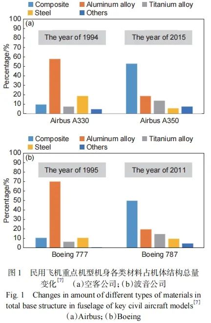 正 文 航空航天结构材料是国民经济发展和国防建设不可或缺的支柱材料,是支撑高端装备和重大工程需求的核心材料,在航空航天、武器装备等战略领域发挥着举足轻重的作用。在国家各类计划的支持下,我国已初步建成航空航天结构材料研发和生产体系,金属、非金属及其复合材料等产品不断优化,部分研究成果达到国际先进水平,材料的性能、可靠性、批次稳定性、经济性等方面都有较大幅度的提升。例如,T300级~T800级的国产碳纤维实现产业化规模生产,有力支撑了重大航空航天装备的研制和批产;研制发展了四代单晶高温合金和粉末高温合金,单晶高温合金的承温能力从第二代单晶的1050 ℃提高到第四代单晶的1100 ℃[1],国产粉末高温合金涡轮盘、挡板等关键部件也用于多个在研在役军民用航空发动机[2];7085铝合金厚大截面材料和Ti-6Al-4V钛合金锻件国产化,解决了大飞机关键材料的若干问题[3];自主研发的抗氧化Cf/C、SiCf/SiC高温结构陶瓷及其复合材料有力保障了若干重大装备的研制和生产[4]。以上典型研究进展有力支撑和促进了我国航空航天装备的快速发展。 本文综述航空航天先进结构材料近年的技术现状及发展趋势,同时明确该领域亟待突破的困境。面对当前航空航天材料技术在轻质高强、耐温耐蚀、低成本、复合化、多功能等方向的新一轮发展机遇,我国亟需打破国外技术封锁和市场垄断,形成体系化自主研制和保障能力,满足航空发动机、重载火箭、国产大飞机等航空航天重大装备对关键结构材料的需求。 1 航空航天先进结构材料战略意义 “一代材料,一代装备”是对航空航天技术发展与其关键材料间相辅相成关系的真实写照[5]。一方面,国家战略需求加速航空航天新品种材料不断涌现,推动材料性能持续提高、研究方法不断创新、制造技术不断进步;另一方面,航空航天材料领域理论、技术、产业的纵深发展也推动其应用领域的不断拓展,加速下游高端装备的不断进步。因此,航空航天材料的研发,既牵引国家新材料的产业发展,又推动高端装备更新换代,对整个社会的技术进步和经济建设具有显著的辐射带动作用。 高性能高分子材料、高性能纤维与复合材料是高端装备制造、航空航天等领域不可或缺的关键战略材料。目前,我国高性能高分子及其复合材料进口依赖度较高,部分关键核心技术依赖进口,对相关产业的可持续健康发展造成极大隐患。加强高性能高分子及其复合材料的关键科学和技术问题研究,建立完善的工程验证和产业体系,对于推动国内大循环健康有序发展、提高我国先进制造业的科技水平和国家竞争力具有战略意义。 高温与特种金属结构材料是航空航天发动机、重型燃气轮机、超超临界火电机组、重大科学装置等高端装备中不可或缺的关键材料。目前,我国在高温与特种金属结构材料的基础研究和技术应用方面与国际先进水平仍有差距,存在部分关键材料和特种型材依赖进口、质量稳定性差、技术成熟度低、成本高等问题,亟待发展一批高服役性高温与特种结构材料,突破我国重点型号及高端装备用高温与特种结构材料技术和应用瓶颈,实现创新链、产业链的自主可控和安全高效,为航空航天强国、能源强国建设提供关键材料支撑。 轻质高强金属及其复合材料具有密度低、高强高韧、耐温耐蚀、高导电、高导热、易加工成型、综合应用成本低等显著优势,是航空航天、军事装备、电子信息等众多领域主结构及关键系统所需的关键材料,历来受到各国政府和军方的高度重视。轻质高强金属及其复合材料性能水平和应用状况已成为衡量大飞机、航空发动机、重载火箭、高超声速飞行器等国家重点发展领域先进性的重要指标。在当前新的国际形势下,加速发展我国自主轻质高强金属材料技术体系势在必行。 先进结构陶瓷及其复合材料是高端装备的核心材料和部件,在航空航天、信息技术、先进制造和国防军工等关键领域发挥重要作用。近年来,我国在结构陶瓷与陶瓷基复合材料领域的科技创新能力不断提升,但关键材料仍然“受制于人”,瓶颈技术亟待突破。高性能结构陶瓷材料、无机纤维及其复合材料、超高温陶瓷复合材料、极端环境特殊结构陶瓷及复合材料、新型无机非金属结构材料等高端材料和产品在诸多重大应用与装备领域均受到“卡脖子”制约,供应链安全受国际关系影响巨大。亟需解决关键核心材料与部件配套及产业链整合两大问题,为国家相关领域的高质量发展提供支撑。 2 航空航天结构材料技术现状及发展趋势 在役的航空航天结构材料中,金属结构材料仍为主导。美国、英国、德国、日本等发达国家在研究、制造、评价、应用等方面占据世界领先地位,通过材料计算和性能预测、数字模拟和应用评价、组织性能与多场耦合环境寿命评估等关键技术的成熟应用,已形成了完善的材料技术体系,拥有庞大系统性数据库。 为满足未来航空航天器轻量化的战略需求,轻质高强复合材料技术发展迅速,其工艺的提升对提高飞行器性能、降低研制生产成本、提高服役可靠性具有极为关键的作用[6]。图1展示了空客与波音公司重点机型机身各类材料占机体结构总量的变化,复合材料的用量明显大幅度增加[7]。美国、日本等发达国家在复合材料研发、工程化水平、批产能力、产品竞争力和应用等方