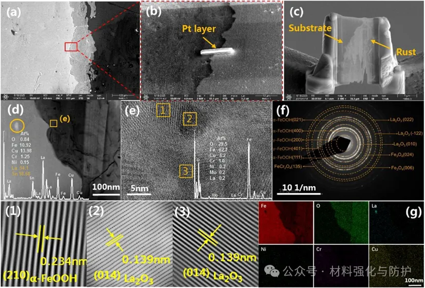 在锈层中作者检测到了5-10nm的La₂O₃纳米氧化物,其在增强耐腐蚀性中起关键作用。除了作为腐蚀抑制剂和pH缓冲剂外,该纳米氧化物还能够作为α-FeOOH的成核位点促进保护性锈层的形成。