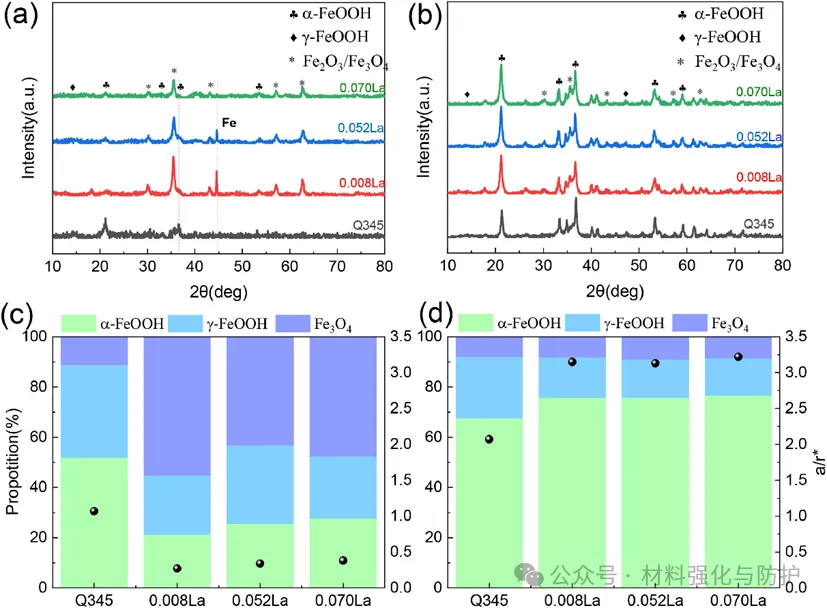 不同腐蚀时间后不同钢材的XRD分析:(a, b)分别为腐蚀5天和30天后锈层的XRD图谱,(c, d)分别为腐蚀5天和30天后各种腐蚀产物相的相对含量和α/γ*比值,其中黑点对应于各种钢的α/γ*比