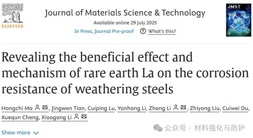 近日,北京科技大学的李晓刚教授团队研究了不同La含量的耐候钢在锈层中的状态及La对耐候钢耐腐蚀性的作用,揭示了稀土在耐候钢中的防腐机制。研究结果于2025年7月29日以“Revealing the beneficial effect and mechanism of rare earth La on the corrosion resistance of weathering steels”为题发表在国际期刊《Journal of Materials Science & Technology》上。