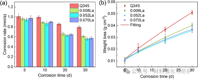 少量La添加能显著提升耐候钢在模拟工业环境中的耐腐蚀性,在20–30天循环腐蚀后,含La钢的腐蚀速率较无La的Q345钢降低23%-30%,含La钢的腐蚀坑更小更浅,直径多低于20μm,而Q345钢出现大尺寸腐蚀坑,直径可达200μm,深度 50μm。但La添加量超过0.052%时其对耐腐蚀性的提升作用会减弱甚至产生不利影响。