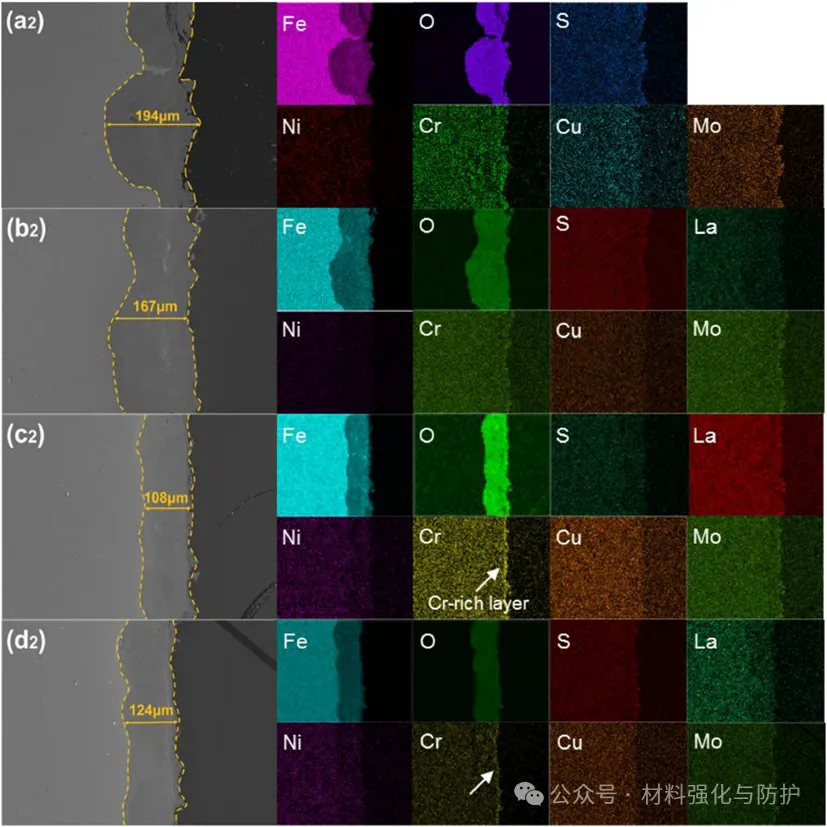 La可通过调控锈层物相和结构提升耐腐蚀性,腐蚀初期La促进γ-Fe₂O₃/Fe₃O₄形成,后期促进α-FeOOH转化,使0.052La钢的α-FeOOH与γ-FeOOH、γ-Fe₂O₃/Fe₃O₄的比值(α/γ*)达到约3.2,锈层更致密。同时,La有利于在最外层锈层形成富Cr致密膜(含FeCr₂O₄、Cr₂O₃),该膜能有效阻碍腐蚀性离子渗透,这种双层致密锈层是含La钢耐腐蚀性优异的重要原因。
