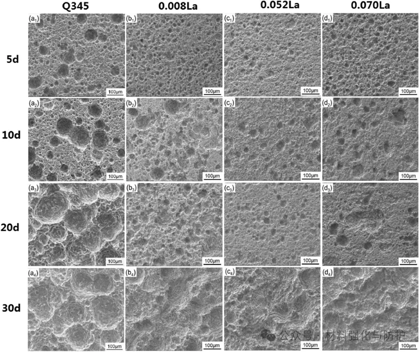 不同钢在不同周期循环腐蚀后的基体腐蚀形态:(a) Q345, (b) 0.008La, (c) 0.052La, (d) 0.070La。下标1-4分别代表5、10、20和30天