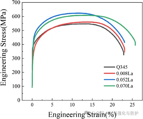 La微合金化能延迟珠光体转变并促进贝氏体转变,形成粒状贝氏体组织,少量添加La可大幅提高耐候钢的强度和延展性,且所有参数均符合GB/T 714-2015标准要求。其中,0.052La钢的屈服强度达449MPa,抗拉强度达624MPa,力学性能最优。