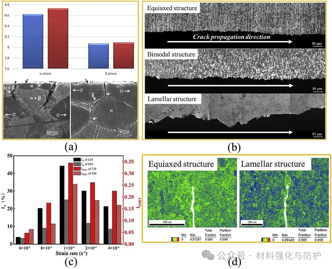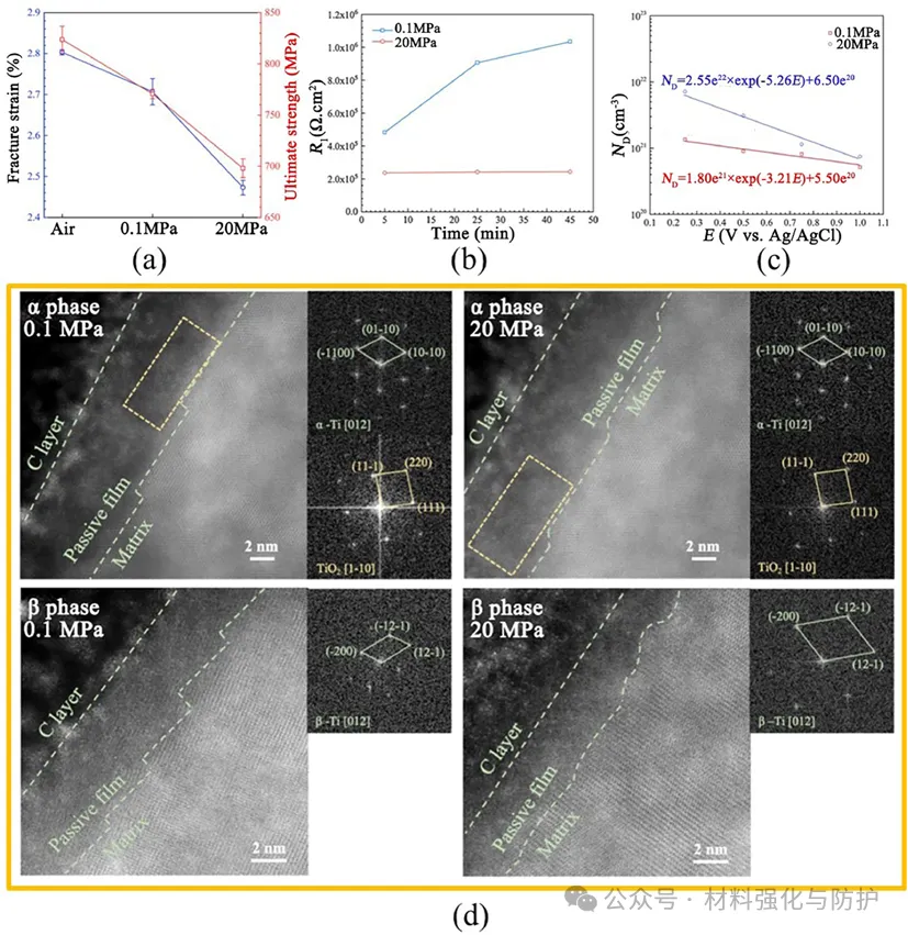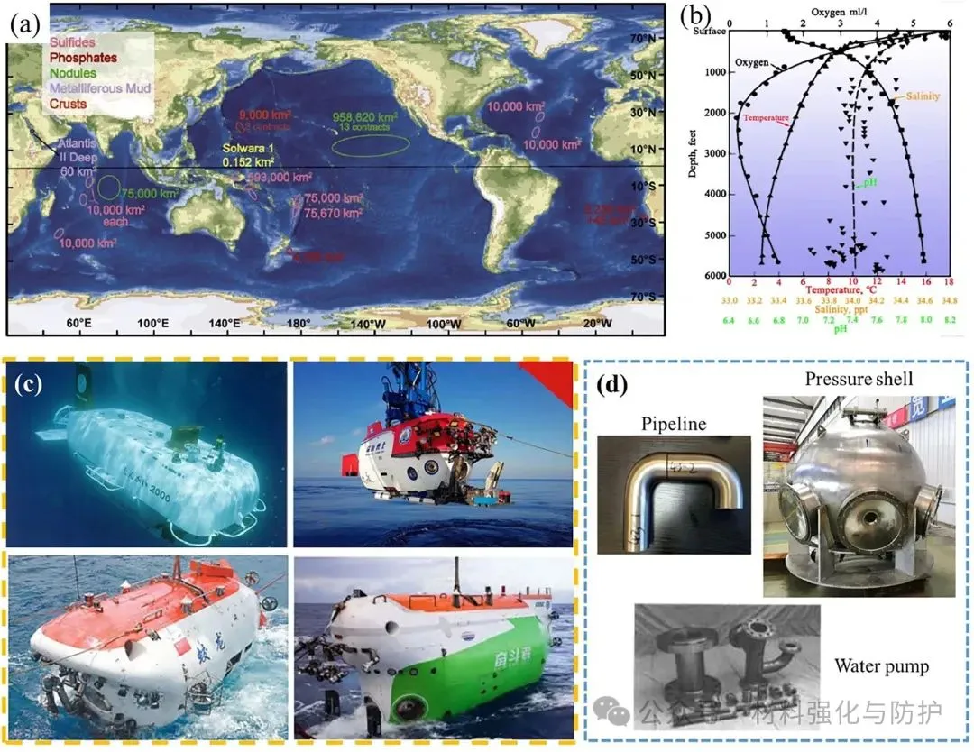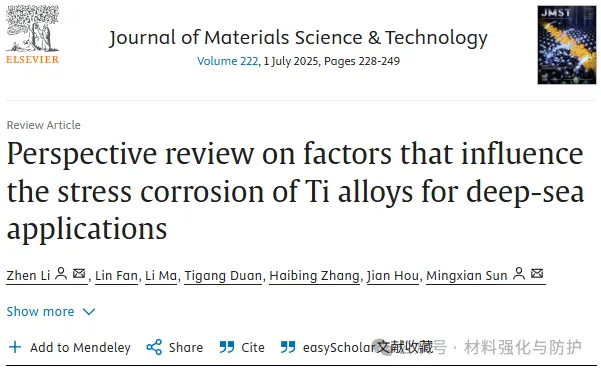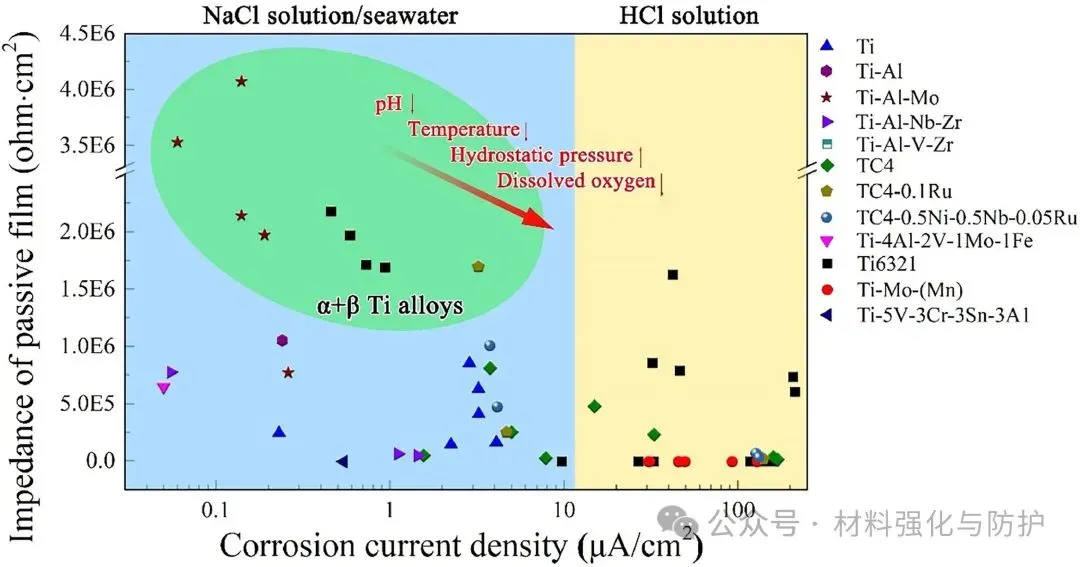海洋蕴藏储量巨大的资源,人类对于海洋的开发还远远没有触及海洋的极限,近年来随着各类高强结构材料的发展,以及世界各国对资源的需求持续增加,各国都开始将海洋资源的开发不断向深蓝推进,开拓深海资源开采平台,也正因如此,用于深海装备的金属材料正面临前所未有的挑战。在众多合金体系中,钛合金凭借其体系普遍具有的高比强度,优异的耐蚀性和海水兼容性,在深海装备金属材料领域脱颖而出。 即便如此,当钛合金面对复杂极端的深海环境时,面对高静水压、低温、低溶解氧、低pH等问题的同时挑战,钛合金也难以避免的出现局部腐蚀与应力腐蚀(SCC)等时效隐患,这些隐患就如同定时炸弹般威胁着深海装备的长期服役稳定性。洛阳船舶材料研究所副总工程师及海洋腐蚀与防护国家重点实验室副主任孙明先研究员团队聚焦于这一关键问题在《Journal of Materials Science & Technology》发表综述论文,全面评估钛合金在深海环境中的应力腐蚀行为、微观机制及其影响因素,提出未来研究重点与防护策略建议。 【研究背景】 近年来,各国在海洋领域的竞争已从近海逐渐扩宽到了远洋深海,在那些海洋的地步,丰富的石油、天然气以及矿产等资源对每个国家而言都是极其重要的战略资源。但深海的“宝藏”并不是那么好开采的,要想得到这些资源,开采所用的设备就必须能够克服高压、低温、高盐度、低溶解氧等诸多恶劣环境因素,这些因素任一一种都是对材料的直接威胁,但深海金属设备却要同时面对它们,这也对深海设备的材料研究提出了新的挑战。 与其他常用的耐腐蚀材料相比,钛合金有更好的抗点蚀、缝隙腐蚀和晶间腐蚀的能力,在高速流动的海水中也依然能保持优异的耐蚀性,且其在海水和空气中的疲劳极限没有显著差异,也正因如此,钛合金也被誉为是海洋金属。在深海装备需求迅速增加的当下,钛合金再次成为广泛研究的热点,但与浅水环境中的优异表现不同,深海的各种恶劣环境同时作用下钛合金的钝化性能也被大幅削弱,从而导致局部腐蚀的风险,尤其是应力腐蚀造成材料开裂。焊接、加工等后处理过程产生的结构缺陷和内应力,以及与腐蚀电化学的协同作用,是造成钛合金深海应力腐蚀的重要因素。因此,随着深海设备对结构材料需求的增加,了解钛合金在深海环境中的腐蚀行为和主要使用性能对深海工业应用材料的设计至关重要。 (a)世界深海海洋矿石资源的位置;(b)海水的温度、DO含量、pH和盐度随深度的变化;(c)用钛合金制造的载人潜水器;(d)船用设备用钛合金压壳、管道、水泵 【核心内容】 该综述归纳总结了钛合金在深海应用中可能出现的应力腐蚀问题,并系统讨论了包括深海环境因素在内的应力腐蚀机理和影响因素,围绕钛合金的材料分类、结构应用、腐蚀规律与应力作用下的失效机制,系统梳理已有研究成果,明确当前知识空白与技术挑战,同时分析了钛合金在深海中腐蚀电流密度、钝化膜阻抗等性能随环境因子的变化趋势,强调了微观组织(如魏氏组织、晶界构型)、残余应力与氢脆行为在深海SCC中的关键作用。 图形摘要 【综述内容】 ① 深海腐蚀加速钝化膜失稳 现有研究表明,在模拟深海环境中,钛合金的钝化膜出现明显失稳,例如Ti6321合金的腐蚀电流密度显著上升,而钝化膜阻抗下降至浅海环境下的三分之一不到,主要原因是由于深海环境中的低溶解氧含量使得钛合金表面的钝化膜中高价氧化物含量大幅下降,而这些氧化物又恰好是钝化膜维持稳定的重要组分之一。 海洋工程用钛及其合金在NaCl溶液、海水和HCl溶液中的腐蚀电流密度和无源膜阻抗值数据根据文献计算 ② 热处理改善腐蚀抗力,但效果依组织类型而异 对Ti6321、TC4等多种钛合金开展系统热处理研究发现,魏氏组织具有最高的钝化膜阻抗与最低的腐蚀电流密度,显著优于等轴晶组织。 不同状态下Ti6321合金钝化膜在NaCl溶液和海水中的阻抗值,数据由文献计算得到 ③ SCC萌生与扩展机制:阳极溶解与氢脆并存 有大量论文研究成果指出,在裂纹尖端,阳极溶解促使Cl-向裂纹迁移,降低局部pH并打破钝化膜;同时氢原子在α/β界面形成氢化物,促进裂尖扩展。 阳极溶解和析氢引起的SCC ④ 氢化物在α/β界面析出,加剧脆性断裂 实验显示,在模拟深海氢充条件下,Ti4211合金中形成TiH与TiH₂针状氢化物,显著降低断裂韧性与EIS阻抗,裂纹在氢化物附近加速扩展。 (a)Ti4211合金充氢过程中氢化物形成过程示意图;(b)针状TiH氢化物的TEM图像和针状结构TiH和α相矩阵的选择区电子衍射(SAED)图;1(c)Ti4211合金预充氢时间增加后的EIS光谱;(d, d1-d3)Ti4211样品充氢24 h后的横截面图 ⑤ 微生物腐蚀是SCC隐患新源 深海微生物也可能是导致钛合金氢损伤的重要因素。其中,硫酸盐还原菌(SRB)SRB 是广泛存在于自然环境中的厌氧微生物,可以利用硫酸盐物质作为电子受体进行呼吸和代谢,是导致金属腐蚀损坏和设备故障的主要原因之一。 (a)模拟深海中不同预充氢条件下钛合金的抗拉强度、伸长率和断口形貌;(b)模拟深海中不同预充氢条件下钛合金的二次裂纹;(c)Ti中氢脆的机制:应力诱导的氢化物形成、氢增强的局部塑性和氢增强的脱粘 在3.5% NaCl溶液中,0.1 MPa和20 MPa静水压力下TC4合金的力学性能和腐蚀性能 ⑥ 微观组织、残余应力显著影响SCC敏感性 Ti合金SCC在深海环境中的裂纹萌生和扩展可归因于应力集中