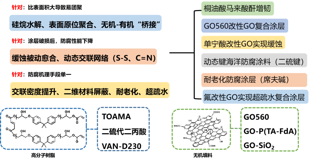 华南农业大学杨卓鸿教授团队是海洋防腐涂料领域的研究专家,课题组针对传统防护技术难以满足海工装备长效防护需求这一关键痛点,创新性开展石墨烯/环氧乙烯基复合涂层体系研究(图3),并取得了阶段性成果。目前,课题组已经成功制备出系列具有不同功能特性的海洋防腐涂料。在制备过程中,以环氧树脂为基底,运用多种生物质原料,通过分子设计和结构优化,对环氧乙烯基酯树脂进行化学改性,赋予其增韧或自修复性能。同时对氧化石墨烯进行化学改性,例如硅烷偶联剂水解、无机粒子表面原位聚合、扩链剂介导的无机-有机“桥接”等方法,显著提升了纳米填料在树脂基体中的分散稳定性。功能化纳米粒子通过物理屏蔽效应、交联密度调控和疏水性等多重机制,大幅提升复合涂层的长效耐腐蚀性能。