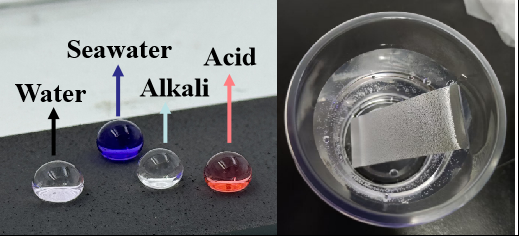 在实验室技术层面,课题组取得了多项突破。在性能优化上,通过建立组分-性能构效关系模型,使涂层在机械性能、热稳定性和电化学防腐性能等方面表现优异。例如结合生物基桐油酸长碳链结构韧性好的特点,将其与环氧树脂刚性苯环相结合,得到的增韧乙烯基酯涂层拉伸强度提升至72.3MPa,断裂伸长率达15.87%。在微观结构调控方面,基于硅烷偶联剂水解、无机粒子表面原位聚合、扩链剂介导无机-有机“桥接”等方法对纳米填料进行化学改性,通过分子间氢键与共价键协同作用机制,显著提升纳米填料在树脂基体中分散稳定性。在功能赋予上,为涂层引入了缓蚀、自愈合、超疏水等多重功能。团队开发"被动缓蚀-主动修复"双重防护体系(图4):基于单宁酸/GO复合涂层的光热响应型自修复系统,在5分钟NIR辐照下可实现92%愈合效率。采用仿生荷叶效应构建的超疏水涂层(图5),其静态水接触角达155.9°,滚动角为1.9°。经过80天的电化学阻抗试验,其涂层电阻仍高达3.62×1010 Ω cm-2。这些突破性成果为发展智能响应型海洋防腐涂层提供了创新范式。