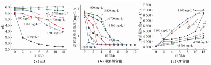 施加0.4V电压,在0.5%(NH4)2SO4、3550mg/LCl-条件下,考察不同初始F-含量条件下闭塞电池模拟装置试验过程中闭塞区pH、溶解氧含量和Cl-含量的变化,结果如图3所示,试验结束后测量计算闭塞区F-含量的变化量与内电极的腐蚀速率,结果如表5所示。