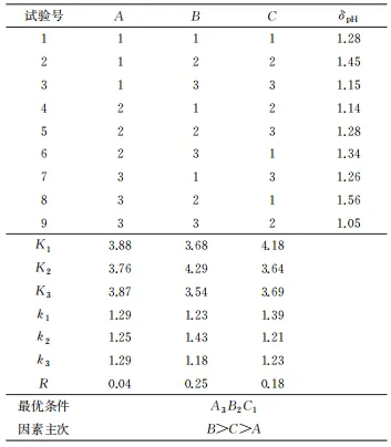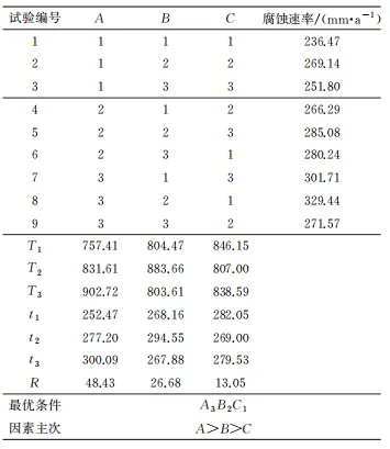 在0.5% (NH4)2SO4、3550mg/L Cl-、1900mg/LF-、溶液温度40℃,外加电压0.4V条件下进行闭塞电池模型主要参数的正交试验。以表征局部腐蚀闭塞电池发展快慢的内电极腐蚀速率和表征闭塞电池自催化酸化效果的闭塞区溶液pH变化量 (δpH) 为指标得到的正交试验结果如表3和表4所示。其中:T1、T2、T3以及K1、K2、K3分别为各因素水平下的腐蚀速率以及δpH之和;t1、t2、t3以及k1、k2、k3分别为各因素水平下的腐蚀速率以及δpH的平均值;R为极差,根据R值大小判断各因素对试验指标的影响主次,并最终确定模型最佳参数组合。