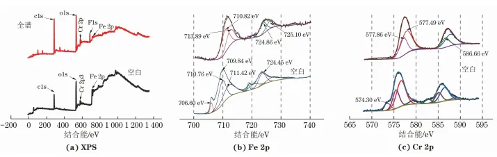 为进一步探讨F-含量对430不锈钢局部腐蚀发展的影响,选取在初始F-质量浓度为5700mg/L下经电化学试验后的内电极(以下简称腐蚀试样) 与空白试样进行XPS全谱图和精细谱图分析,结果如图4所示。