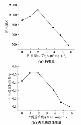 由图2可见:随着初始F-含量的增加, 系统耗电量、内电极腐蚀质量均呈现增大的趋势,并在初始F-质量浓度为1900mg/L时均达到最大;当初始F-质量浓度高于1900mg/L时,随着初始F-含量的增加,系统耗电量与内电极腐蚀量均减小,对腐蚀表现出一定的抑制作用。