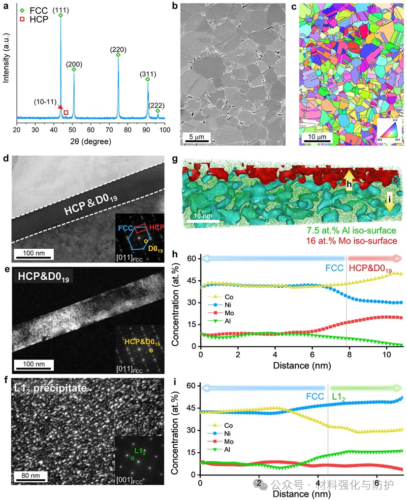 研究团队采用高纯度元素在氧化锆坩埚中进行真空感应熔炼制备合金铸锭,随后经过均匀化、冷轧、退火和时效等热处理工艺,为了对比,按照相同的熔炼制备了具有FCC基体成分的合金,并对冷轧薄板在1273K和1323K下进行退火,以获得不同晶粒尺寸的FCC单相组织。