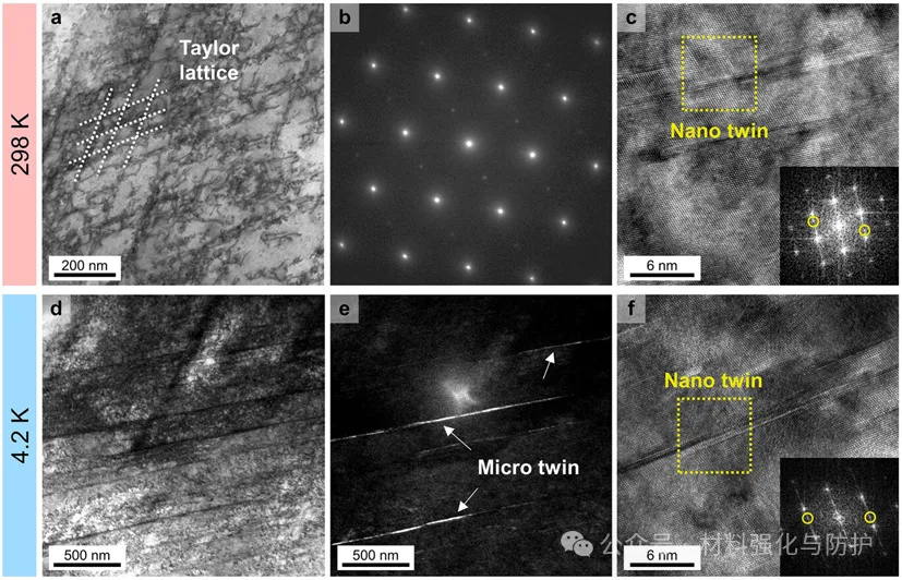 在变形机制方面,表现出了较强的温度依赖性,即不同温度下主导机制发生了一定的转变,室温下,合金的塑性变形主要依赖位错滑移及其交互作用,仅有少量纳米孪晶的形成。而在液氦温区,情况发生了变化,虽然位错滑移依然活跃,但产生了大量孪晶,这些孪晶成为强有力的障碍,增强了位错储存能力和应变硬化率,显著提高了材料的强度和延展性,研究团队将这一现象称为“动态Hall–Petch效应”。