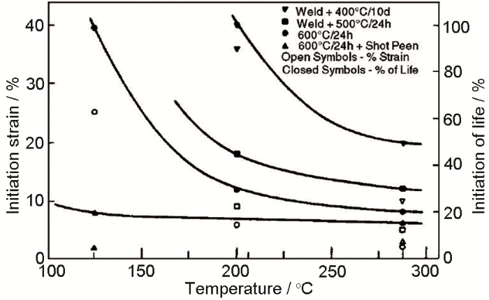 由此看来,温度对不锈钢SCC的扩展与水质条件具有密切关系,且与不同类型的试验有关。此外,Andresen等指出金属热处理工艺、表面状态、焊接等因素也会在温度升高的过程中对304不锈钢表面SCC的萌生带来不同的影响,如图3所示。具有高光洁度的中高度敏化态304不锈钢在175℃附近表现出较强的温度依赖性,而轻度的敏化处理 (weld+400℃) 使其温度依赖性区间升至220~275℃,经过机械喷丸的不锈钢由于硬化层的作用即使在低温时也容易发生IGSCC。