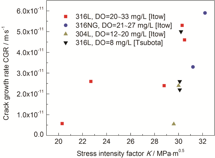 溶解氧对CGR和SCC性能的影响是通过改变材料所处环境的腐蚀电位而起作用的。一方面,O直接参与金属表面氧化膜的形成,影响氧化膜微观结构和性能;另一方面,O分布不均出现腐蚀电位差,电位梯度分布改变了裂纹尖端的水化学环境,影响杂质离子的扩展行为,同时高浓度DO也加速了被溶解金属与金属氧化物之间的传质速率,改变CGR。