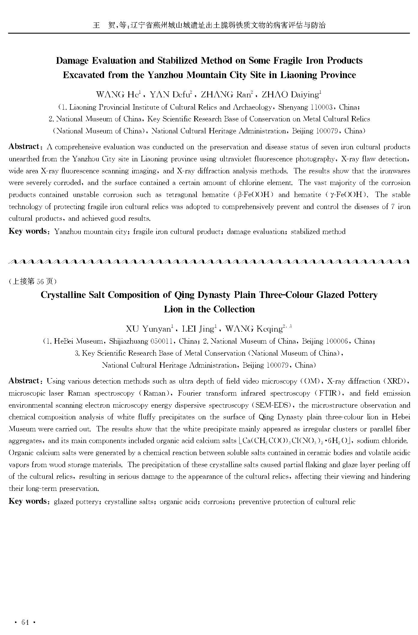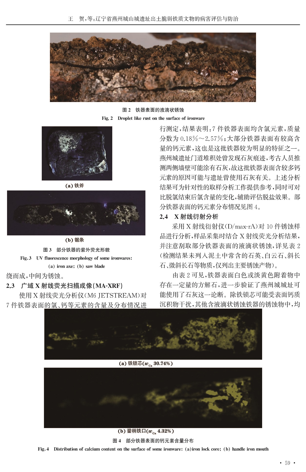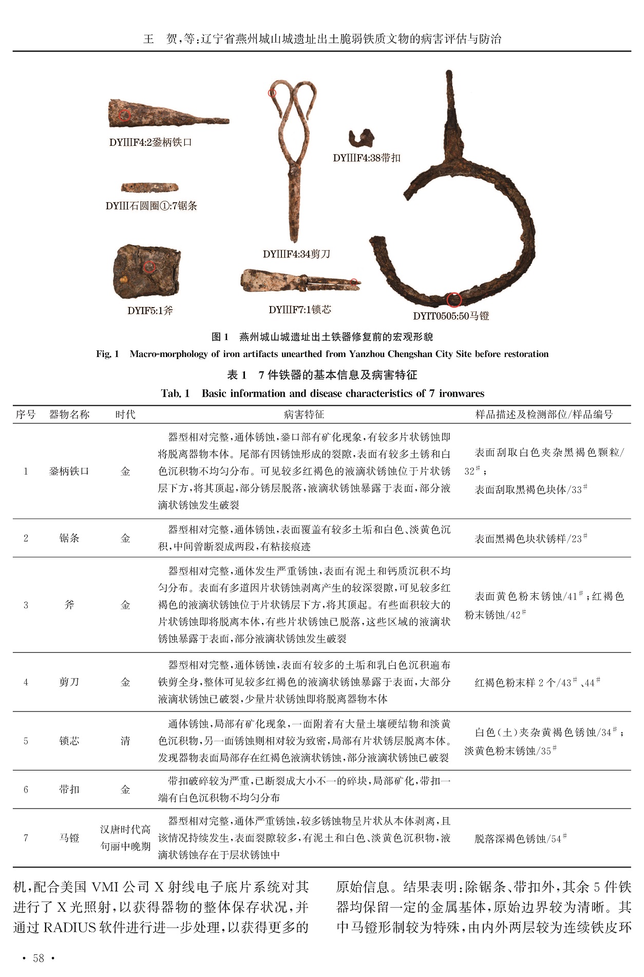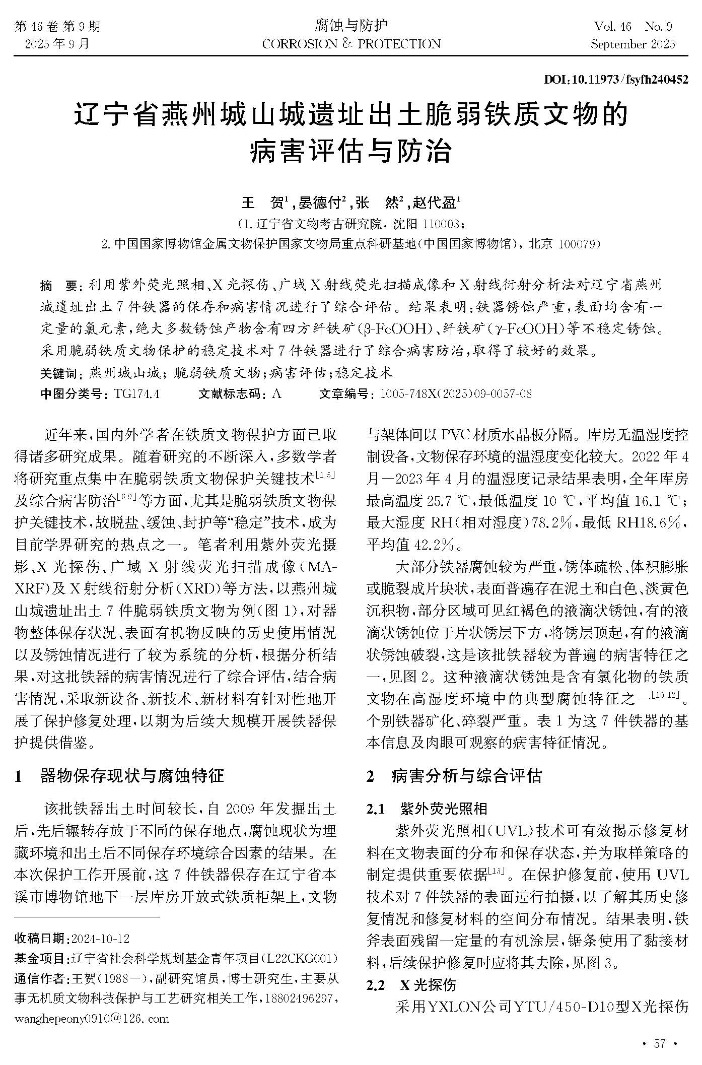 辽宁省燕州城山城遗址出土脆弱铁质文物的病害评估与防治