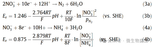 当硝酸盐而非硫酸盐作为MIC的阴极反应中的最终电子受体时,生物催化阴极硫酸盐还原(BCSR)理论就变成了生物催化阴极硝酸盐还原(BCNR)理论,这与BCSR类似。硝酸盐(或亚硝酸盐)可通过异化硝酸盐还原铵(DNRA)被还原为NH4+。生物反硝化是将硝酸盐(或亚硝酸盐)还原为氮气的过程。因此,N2和NH4+可能都是NRB培养物中硝酸盐还原的产物,如以下反应所示:
