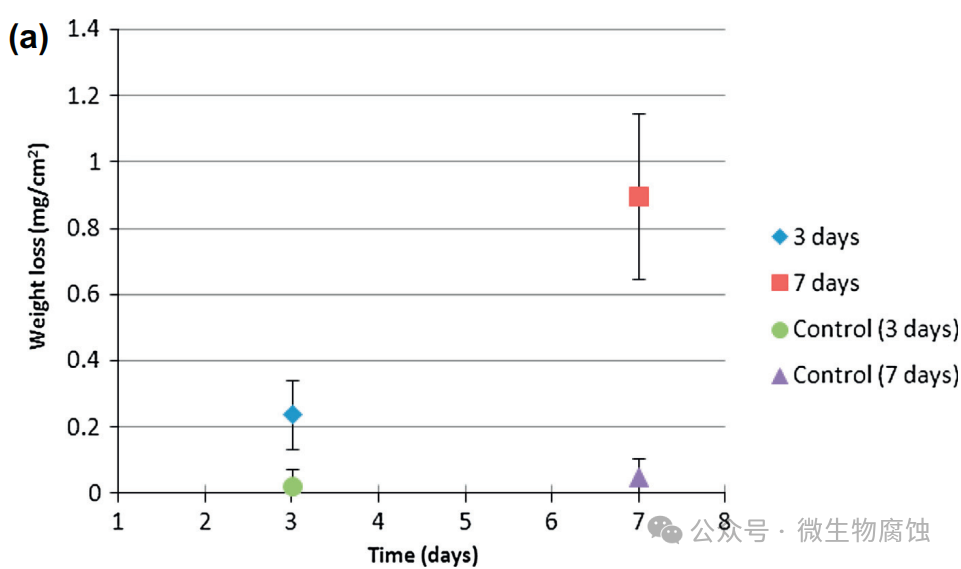 2.重量损失和腐蚀坑深度:图2a展示了在37°C下与地衣芽孢杆菌⼀起培养3天和7天的试样的(归一化)重量损失。3天试样的平均重量损失为0.24毫克/平方厘米,7天试样的重量损失增加到0.89mg/cm2。相比之下,在无生物培养基中培养7天的对照试样的重量损失为0.05mg/cm2,这与图1b⼀致。图2b和c显示,在37°C下与地衣芽孢杆菌⼀起培养3天和7天的最大凹坑深度分别为13.5微米和14.5微米。这些数值(13.5μm和14.5μm)明显大于在实验室中使用碳钢试片进行为期⼀周的测试时,由硫酸盐还原菌生物膜所导致的通常小于10μm的坑蚀深度。因此,在严格厌氧条件下进行的实验室微生物腐蚀坑蚀研究中,本研究中的地衣芽孢杆菌比典型的硫酸盐还原菌更具腐蚀性。