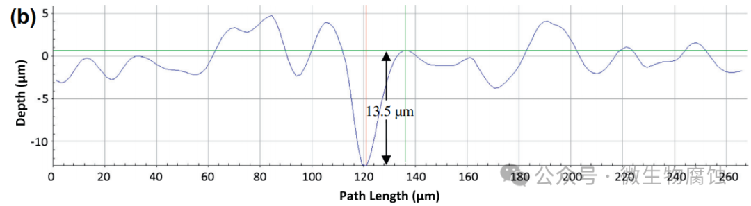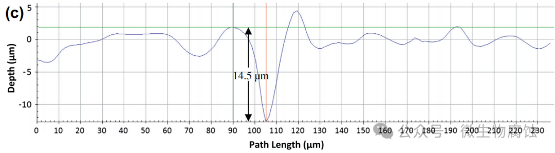 (b)在37°C培养基中培养3天后发现的最大坑深为13.5μm。