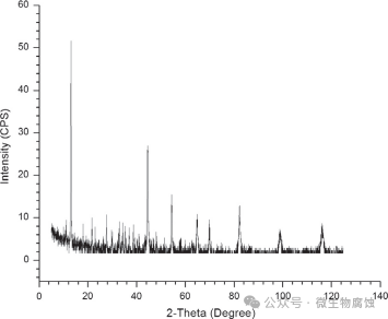 图3.在37°C培养基中培养7天后,C1018碳钢表面腐蚀产物的X射线衍射图谱。