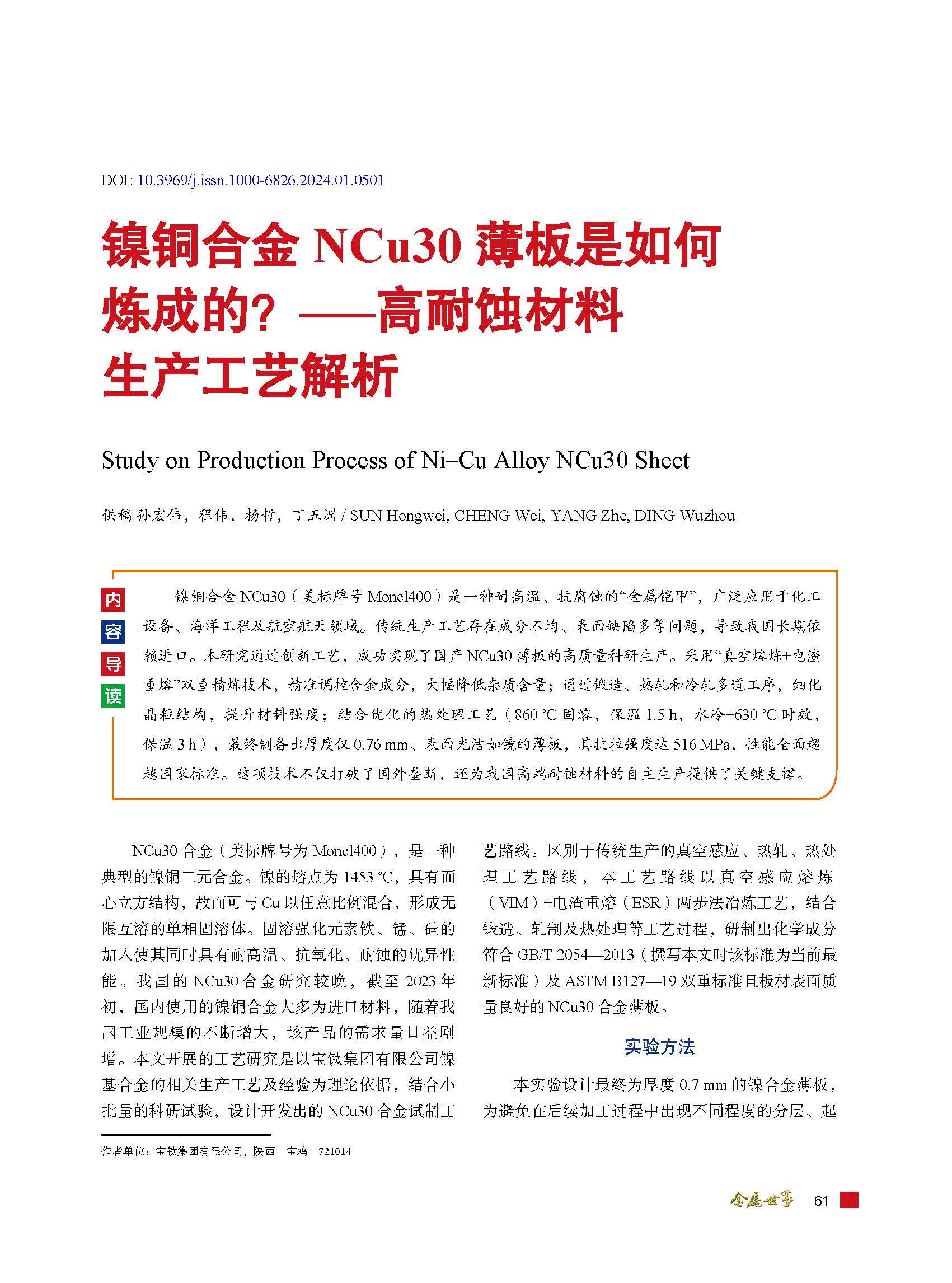 镍铜合金NCu30薄板是如何炼成的?—高耐蚀材料生产工艺解析