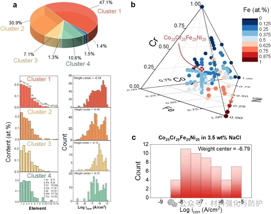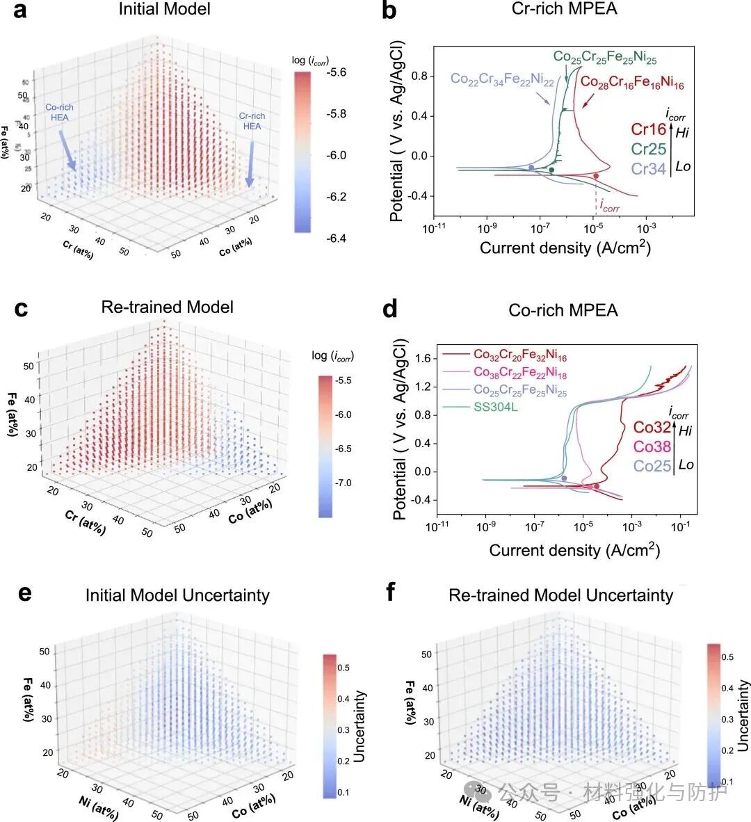 腐蚀不似断裂那般来得剧烈,却又在时间的积累中一点点消磨金属的组织结构完整性。据不完全统计,腐蚀造成的损失占当年国民经济总产值的3%~5%,钢制设备装置因腐蚀造成的报废约为其年产量的30%,全世界每90秒就有1吨钢材被腐蚀成铁锈等。腐蚀是个长期的过程,传统耐蚀金属的设计依赖于经验与反复试验,特别是对于多主元合金(MPEAs)这样的复杂体系,其可能的影响因子较传统的金属材料体系要更多,因此仅靠容错法,工作量巨大且效率极低。 为解决目前常用的依赖于实验制备探究微观结构从而初步判断耐蚀性的设计路径,美国弗吉尼亚理工大学联合多家科研院校提出了一种全新的深度学习框架CORAL(Corrosion-Optimized Resistant Alloy Learning),无需显微结构输入,仅依靠基于成分的物理特征描述符,即可预测Co-Cr-Fe-Ni体系MPEAs的腐蚀速率,这一“微观结构无关”的方法为复杂多元合金的快速筛选与机制理解开辟了新路径,大大缩短了耐蚀Co-Cr-Fe-Ni合金的开发进程。目前这一成果已发表于材料领域的国际期刊《Acta Materialia》。 文章链接: https://doi.org/10.1016/j.actamat.2025.121619 【核心内容】 研究团队建立了一个整合物理学知识的深度神经网络(DNN)模型,融合文献挖掘的腐蚀数据(共1400组)与主动学习实验数据。该模型以成分相关的物理特征(如价电子浓度、原子尺寸差、电负性、Pilling-Bedworth比值、混合熵等)为输入,并通过dropout随机失活、Gaussian噪声增强与不确定性量化来抵消不同文献中由显微结构引起的实验离散性。 模型能直接预测腐蚀电流密度(icorr),并自动识别关键控制因素。通过对Co-Cr-Fe-Ni体系的大规模扫描,CORAL精准识别出Cr-rich与Co-rich区域的低腐蚀率组成,并预测了新型耐蚀合金成分。 CORAL深度学习框架的工作流程与架构设计 基于随机森林的特征重要性分析与交叉验证 【研究方法】 该研究利用Scopus数据库进行了全面的文献检索,收纳了过去20年来关于高熵合金腐蚀的研究。在约3400篇论文中,提取了合金成分、制造和加工条件、显微组织、腐蚀速率等数据,从中获得了约5700组数据。最后从455篇论文中选出了1400条有效数据。为保证模型的可解释性,团队基于物理概念设计输入特征,而非简单统计特征,包括电子结构参数(VEC)、化学反应性(电负性)、几何参数(原子半径差)、热力学参数(熵)以及氧化膜几何因子(P-B比)。 采用五层深度神经网络进行训练,并通过Monte Carlo dropout方法实现贝叶斯近似,用以评估预测的不确定性。在初次模型预测后,实验合成并测试了35组新合金,将数据反馈入模型,从而提升了Co-rich区的预测可信度。采用真空电弧熔炼制备多组Co-Cr-Fe-Ni非等原子比合金,随后进行XRD、EDS、EBSD结构表征及电化学测试,并通过APT分析腐蚀膜成分分布。 文献数据库的聚类分析与成分-腐蚀性能关联 CORAL模型预测性能与实验验证对比 【研究成果】 ① Cr富集与Co富集合金的双峰耐蚀区域 实验合成的Cr16(Co28Cr16Fe28Ni28)、Cr25(Co25Cr25Fe25Ni25)、Cr34(Co22Cr34Fe22Ni22)三种合金均呈单相FCC结构,CORAL模型在Co-Cr-Fe-Ni全成分空间中预测出两个显著的耐蚀“蓝区”:一个Cr富集区和一个Co富集区。于进一步合成了Fe34Cr34Ni16Co16与Co34Cr34Fe16Ni16两种合金,并分别标记为Fe34Cr34和Co34Cr34合金,其微观结构仍为面心立方结构。 Cr含量对Co-Cr-Fe-Ni MPEAs相结构与成分均匀性的影响 Fe34Cr34与Co34Cr34 MPEAs的相组成与显微组织 MPEAs的晶粒尺寸与取向分布 ② 模型自主学习优化后预测的合金耐蚀性 Fe34Cr34在酸性环境和富氯环境下均表现出了极低的腐蚀电流(10-8 A/cm²),这一结果要远优于304L不锈钢,而模型预测的另一种Co34Cr34合金,其腐蚀膜厚度仅约9nm,薄于目前所报道的富Cr高熵合金(14nm),这进一步证明了,经过自主学习优化后,该模型的准确率与预测能力得到了提升。 CORAL驱动的成分优化路径与多环境腐蚀验证 模型预测准确性评估与特征贡献度解析 APT三维重构揭示钝化膜厚度与元素分布差异 ③ 深度学习与DFT结合揭示腐蚀机制 团队发现所有具有较高电子功函数与氧吸附能(BE)的合金具有更强的钝化膜形成倾向,同时无论是根据CORAL模型的特征权重,还是DFT计算的表面吸附能,各项元素作用效果量化出的大小关系均为Cr>Fe>Co>Ni,其中Cr元素在促进钝化膜形成中的作用最为显著,而Fe的高功函数则贡献了膜的致密性。 DFT计算与实验腐蚀性能的关联机制 【总结与展望】 这项研究表明,腐蚀行为的设计与优化,不再需要完全依赖微观结构信息才能准确预测,而可由成分与电子特征直接驱动,这一成果有望大大提高耐蚀合金的设计效率,在广泛的耐蚀材料设计领域中具有潜在的应用前景。
