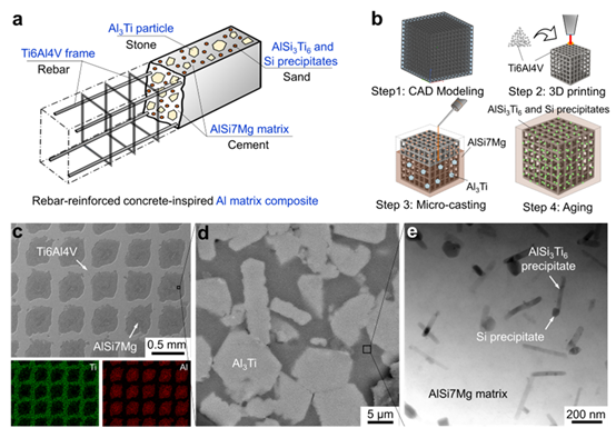 图1:受钢筋混凝土启发的耐高温铝基复合材料(RC-AMC)微观结构图。a.多尺度强化RC-AMC微观结构示意图。b. RC-AMC制备过程示意图。c.亚毫米尺度下的微观结构和成分。d. 嵌入铝基体中的微米级 Al₃Ti 颗粒。e.嵌入铝基体中的纳米级 AlSi₃Ti₆和球形硅化物。