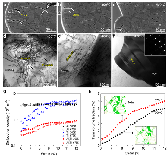 图4:RC-AMCs高温变形特征与显微组织。a-c. 不同温度下Ti6Al4V骨架附近 Al₃Ti 颗粒内部或颗粒间的裂纹,测试温度分别为 (a) 200°C、(b) 300°C 和 (c) 400°C。样品在400°C压缩后的典型微观结构:d. AlSi7Mg 中的位错网络;e. Ti6Al4V中三重滑移系开动;f. Al₃Ti 颗粒中大量的机械孪晶。分子动力学(MD)模拟统计结果:g. 位错密度;h. 孪晶分数。