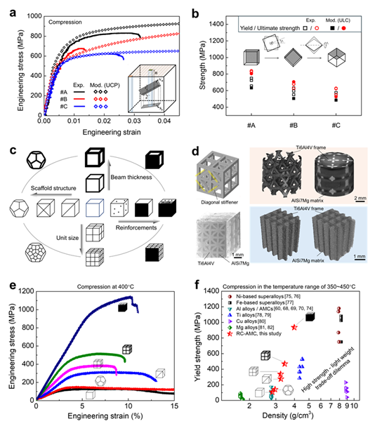 图7:RC-AMC的预测、优化及发展,规避高强度–轻量化的权衡困境。a. 单元胞投影(UCP)模型预测的应力–应变关系。b. 单层复合(ULC)模型预测的屈服强度与抗拉强度。c. RC-AMC 中 Ti6Al4V 骨架的结构优化或调整,以实现不同强度与延性组合。d. RC-AMC 变体示例。e. 不同 RC-AMC 衍生结构在 400°C 下的压缩应力–应变曲线。f. RC-AMC 在高温下的强度–密度关系,并与其他工程合金进行比较。