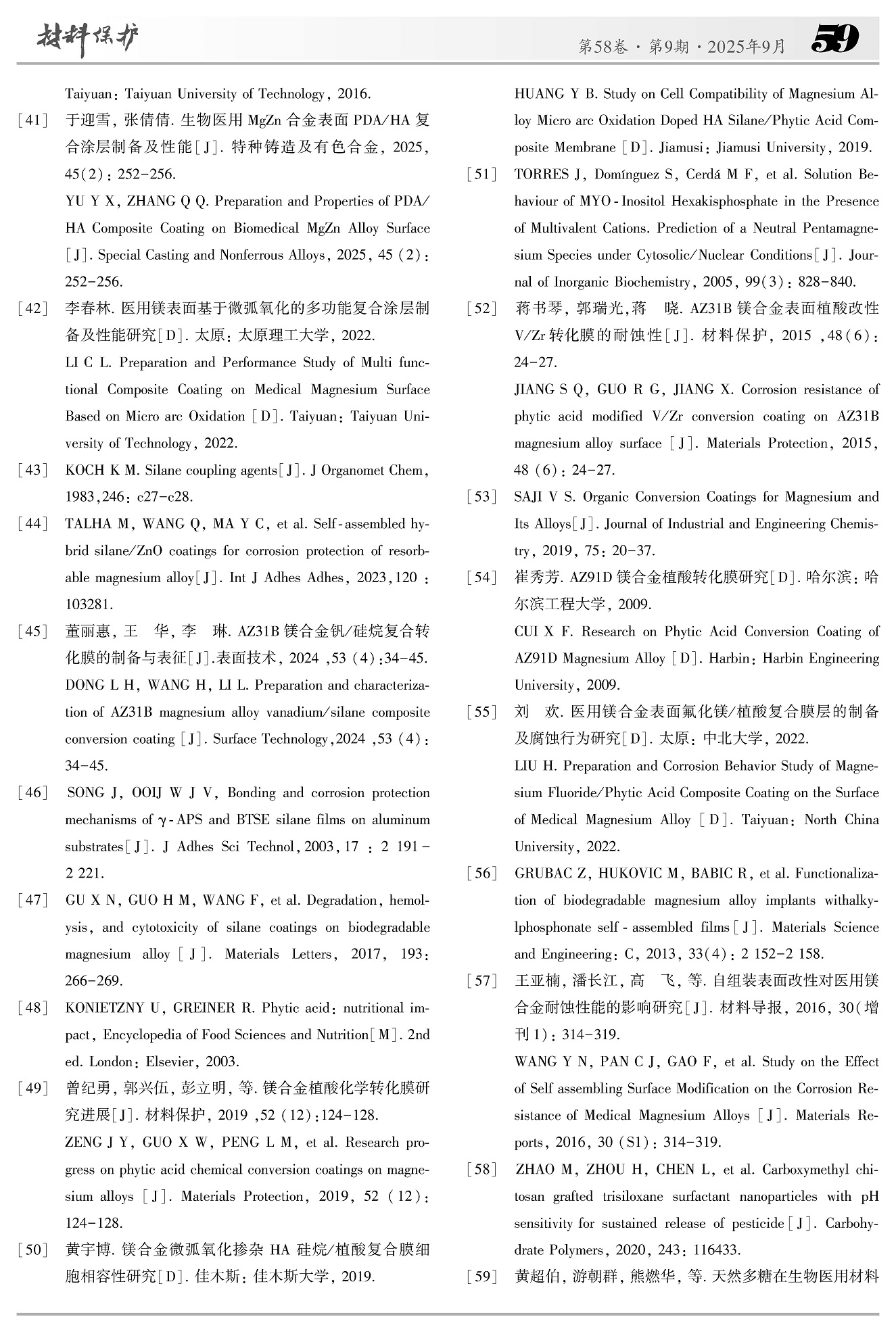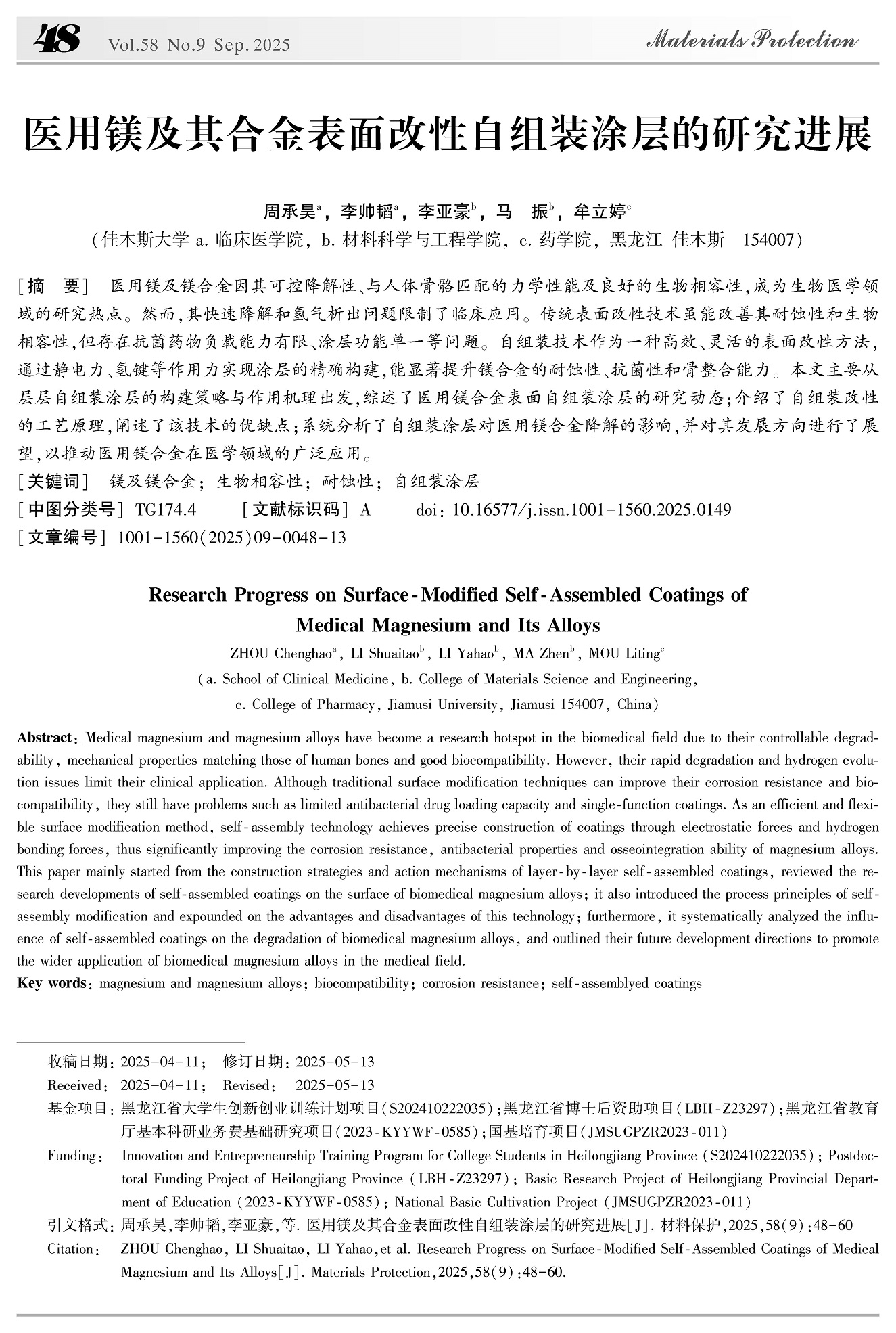 医用镁及其合金表面改性自组装涂层的研究进展