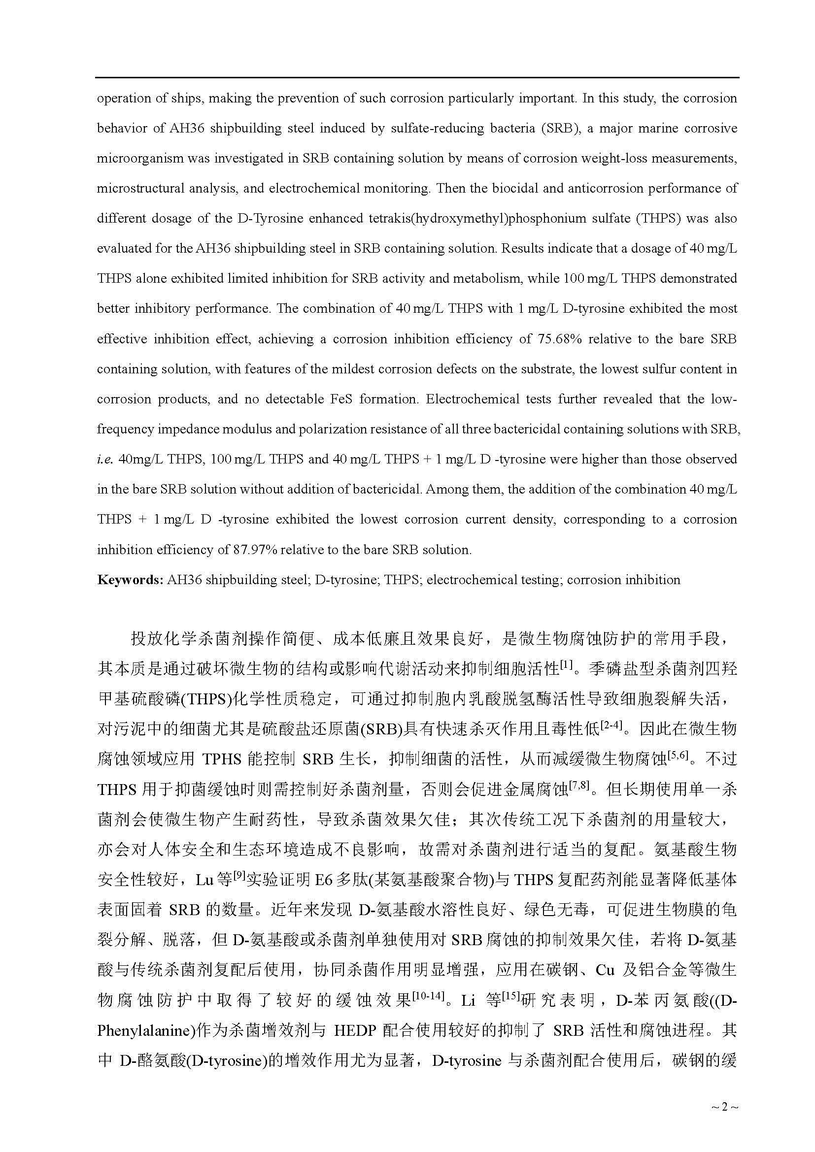 D-tyrosine增强AH36船体钢THPS杀菌腐蚀防护效用研究
