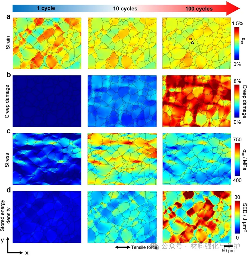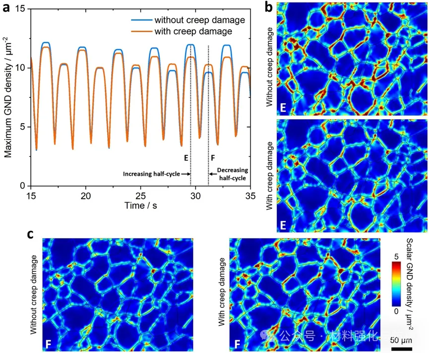 蠕变损伤对总SED的贡献随温度升高而增加,450°C时约5.3%,600°C失效时达11%。另外,蠕变损伤显著加剧循环软化,降低局部滑移阻力、减小弹性模量,且放大应变局部化,与实验观察一致。600°C每循环内,GND密度在卸载状态达最大,峰值/谷值载荷时最小。蠕变损伤可减小循环内GND密度波动,且GND在晶界集中,与 EBSD 实验结果吻合。