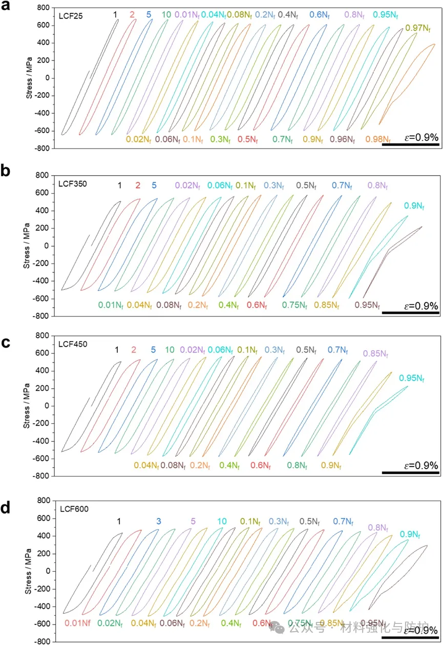 LCF寿命随温度升高显著降低,高温下蠕变损伤加速失效。室温(25°C)下应力振幅在初始100循环内快速下降,随后长期稳定,表现为循环软化,变形机制以晶粒内部均匀位错滑移为主。350-600°C高温下循环硬化,应力振幅先升高,后稳定或逐渐下降。