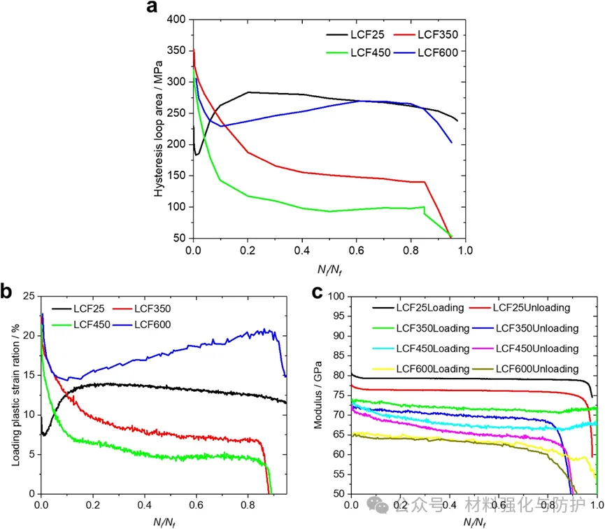 滞后环面积反映每循环的能量耗散,室温下滞后环面积先增后减,高温下初始10%寿命内滞后环面积骤减,热激活位错攀移、扩散增强位错相互作用,形成复杂位错网络,提升应变硬化能力,450°C时持续减小,600°C中期后增大。另外,由于晶格振动增强、原子扩散导致点缺陷增多、位错网络重排及晶界微缺陷积累,25-600°C初始拉伸弹性模量从80.6GPa降至65.4GPa,高温下模量持续下降。