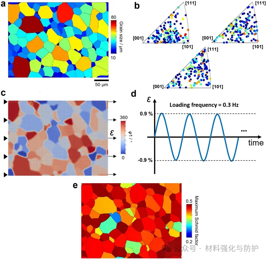该研究通过“实验+模拟”结合的方法开展,实验上以各25at.%的99.9wt.%纯度Hf、Nb、Ti、Zr通过感应悬浮熔炼、80%冷轧和800°C真空退火1h,制备出ASTM E466-07标准的LCF试样。在25、350、450、600°C下以0.9%应变振幅和0.3Hz频率进行对称拉压循环,记录应力-应变响应。通过XRD、SEM、EBSD分别分析相组成、微观结构/断口及晶粒/应变分布。在CPFE模拟上,基于EBSD构建RVE,通过有无蠕变损伤的对比模拟量化其影响,且参数结合实验与文献数据校准。