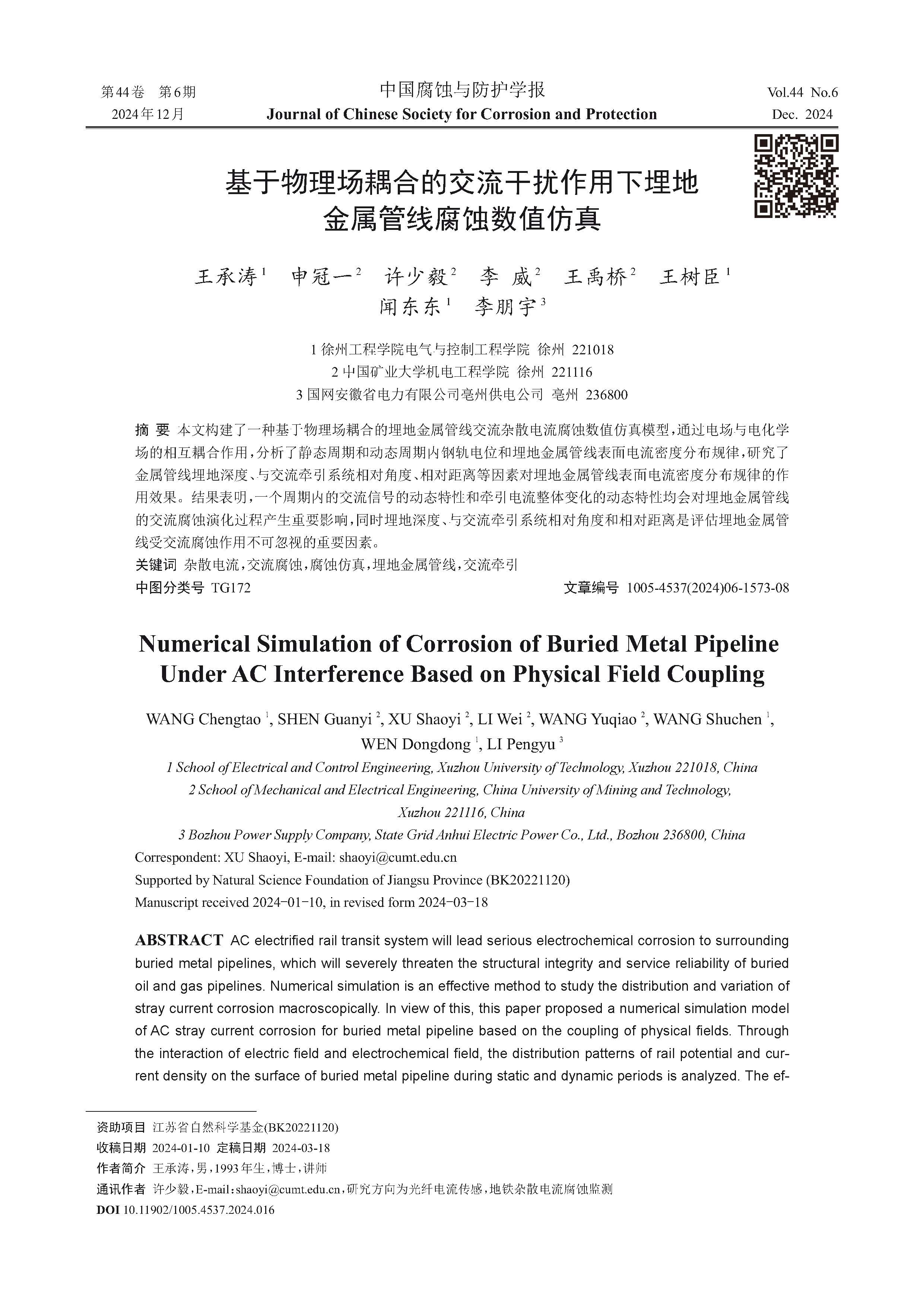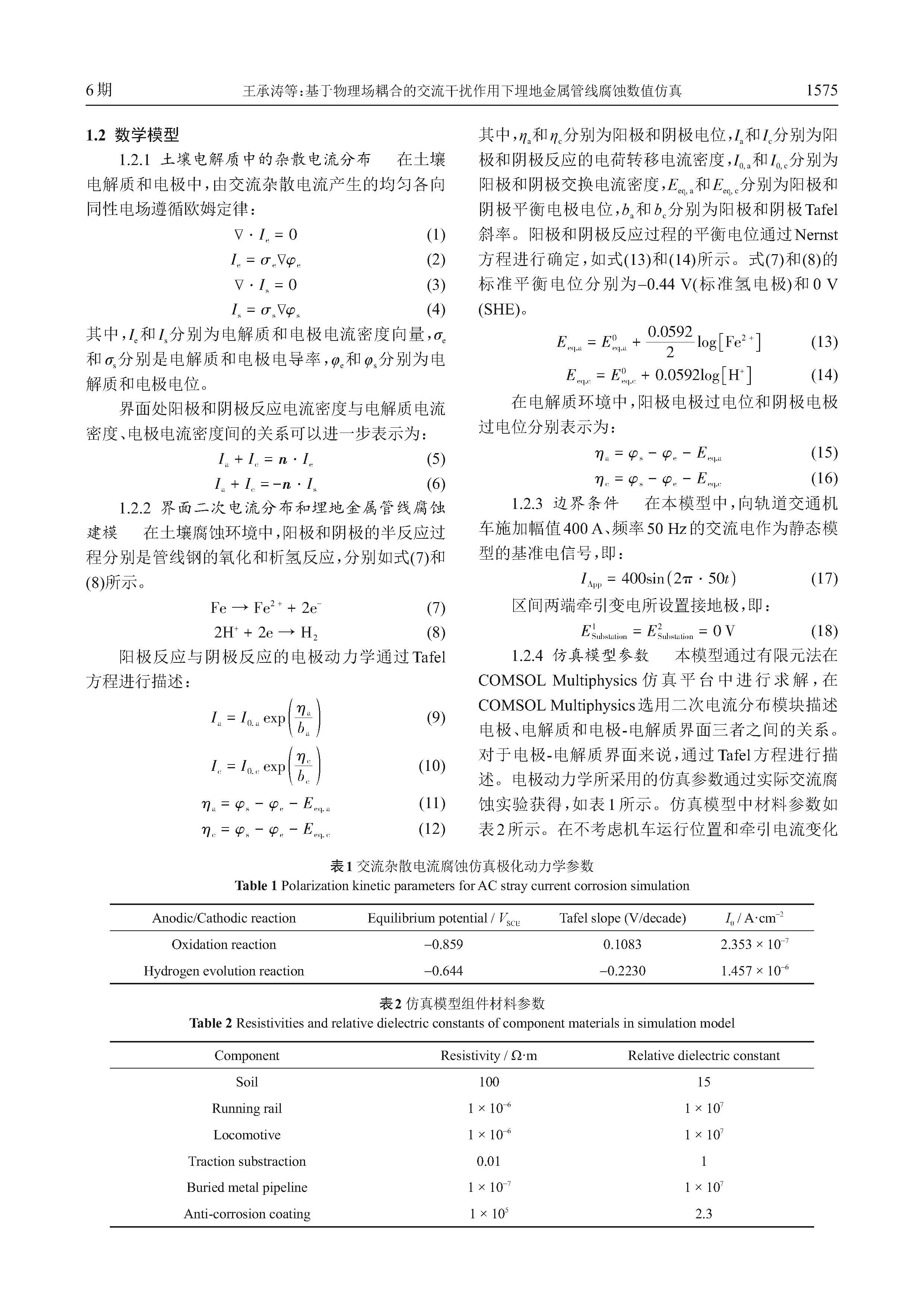 基于物理场耦合的交流干扰作用下埋地金属管线腐蚀数值仿真