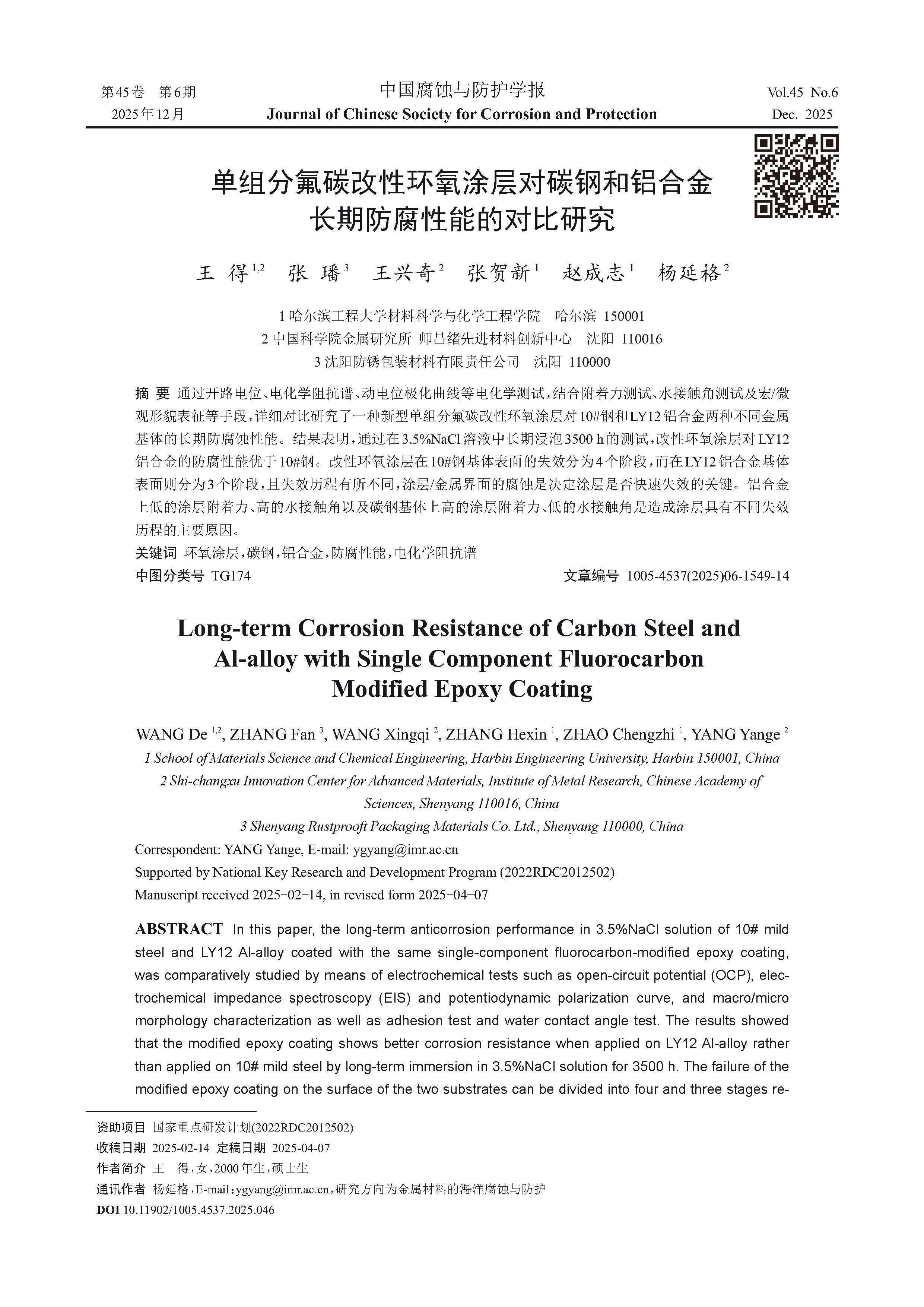 来源:中国腐蚀与防护学报