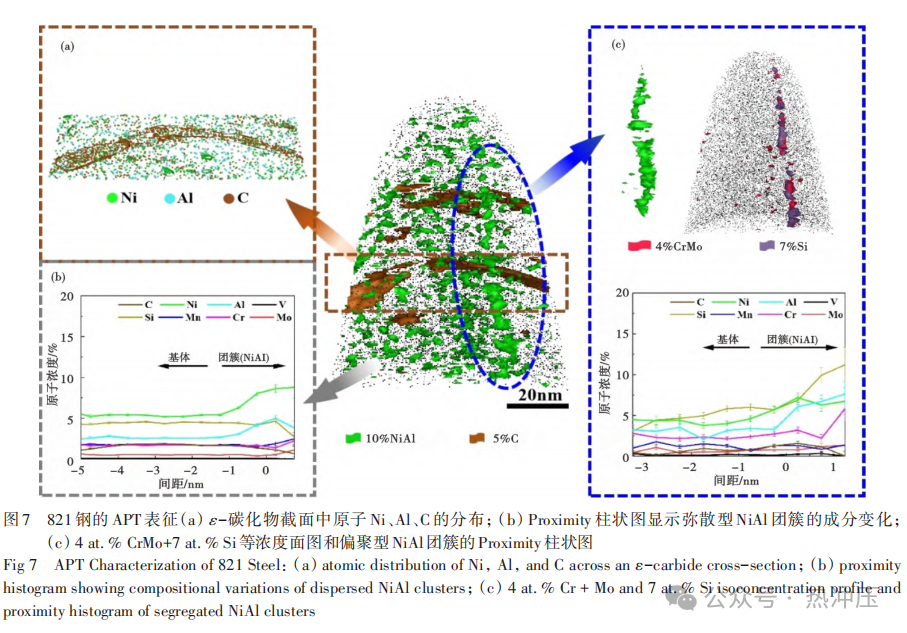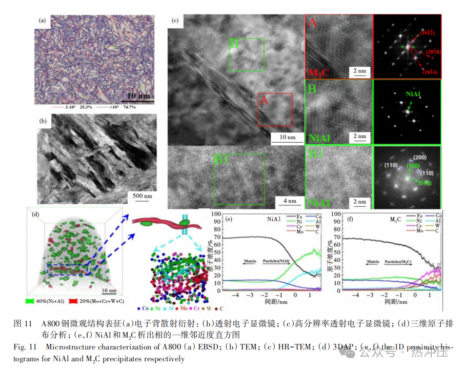 818钢采用真空感应→真空自耗→锻造(锻比≥12)→热处理工艺流程,以3N级高纯铁为原料。其名义成分(质量分数)%为0.32C-2.0Si-1.1Mn-0.6Cr-2.2Ni-0.3Mo-0.4V,杂质元素严格控制:S、P、O、N、H总量82×10-6,As、Sn、Sb、Bi、Pb总量130×10-6。 团队开发的“深冷处理+二次淬火”工艺通过先消除后重新生成残余奥氏体(RA)的策略,获得了细小弥散的RA组织,如图5所示,显著提升了其稳定性与分布均匀性。在RA含量相近条件下,该工艺使冲击功较传统处理提升15%,最终获得抗拉强度1 909 MPa、屈服强度1 432 MPa、伸长率12%、V型冲击功50.8 J的优异综合性能[49-50]。 819钢采用真空感应→真空自耗→锻造(锻比≥13.5)→热处理工艺流程,以3N5级高纯铁为原料。其名义成分(质量分数)%为0.35C-1.62Si-0.86Mn-1.62Cr-3Ni-0.45Mo-0.22V,杂质元素严格控制:S、P、O、N、H总量45×10-6,As、Sn、Sb、Bi、Pb总量23×10-6,较818钢降低。 经980℃淬火+280℃回火后,819钢形成由板条马氏体、残余奥氏体与ε-碳化物组成的复合组织,如图6所示。其优异的强韧性源于协同作用机制:高位错密度板条马氏体与弥散ε-碳化物提供强化效应,板条亚结构与薄膜状残余奥氏体提供韧化贡献。最终获得抗拉强度2 013 MPa、均匀伸长率11%、夏比U型冲击功67.2 J的综合性能[51]。 821钢采用真空感应→真空自耗→锻造(锻比≥12)→热处理工艺流程,以3N级高纯铁为原料。其名义成分(质量分数)%为0.31C-2Si-1Mn-1Cr-5Ni-0.6Mo-0.1V-1.3Al,杂质元素S、P、O、N、H总量89×10-6。 经970℃淬火+180℃低温回火后,821钢组织由板条马氏体、残余奥氏体、ε-碳化物及高数密度纳米级NiAl团簇构成,如图7所示。均匀分布的NiAl纳米团簇可优化位错分布、减轻界面位错塞积,有效延缓微裂纹萌生,赋予材料卓越的强韧性:抗拉强度1 894 MPa、均匀伸长率接近15%、U型缺口冲击功83 J、断裂韧性高达108 MPa·m1/2[49]。 3.2高合金超高强钢 本研究通过在二次硬化钢中引入NiAl相(与Co协同),将M2C碳化物数量密度提升至1024 m-3。NiAl相与M2C碳化物相互抑制粗化的机制为开发高性能钢种奠定了基础。据此研制的2112钢(0.20C-12Co-13.5Ni-1Al-1.3Cr-1.3Mo-0.6 W)和A800钢(0.26C-13.5Co-14.2Ni-1.2Al-2.1Cr-1.8Mo-0.6 W)(质量分数)%均表现出优异性能。 2112钢采用真空感应→真空自耗→锻造开坯→轧制→热处理工艺流程,以3N级高纯铁为原料,其强韧性匹配如图8所示。 时效温度对2112钢的组织和性能具有显著影响。200℃时效时,马氏体基体中析出亚微米级ε-碳化物和高数密度纳米级NiAl团簇,两者独立形核;高数密度NiAl团簇通过缓解位错塞积,使冲击功达到136 J。500℃时效时,析出相演变为数密度达9.3×1023 m-3的NiAl相和3.3×1023 m-3的M2C碳化物(析出机制如图9所示),二者在高位错密度马氏体基体中均匀分布,协同贡献约600 MPa的屈服强度增量;此外,板条界面形成厚度约20 nm的薄膜状奥氏体,进一步提升了材料的塑韧性[8]。 A800钢采用真空感应→真空自耗→锻造开坯→轧制→热处理工艺流程,以4N级高纯铁为原料,拉伸性能如图10所示。 510℃时效后,马氏体基体中均匀析出高数密度纳米相:NiAl相14.5×1023 m-3、M 2 C碳化物2.2×1023 m-3,后者数密度是AerMet100钢的3倍[54]。在Co协同作用下[55],析出相尺寸控制在0.5~20 nm(图11),通过与位错的交互作用贡献超过1 000 MPa的屈服强度增量。 NiAl-M2C双析出体系呈现协同强化机制:NiAl相优先高密度析出并促进M2C形核[56],双析出提高了M2C数密度、细化了其尺寸并抑制相互粗化[57],显著提升了强度和热稳定性。此外,深冷时效调控形成的均匀薄膜状奥氏体改善了材料韧性[58]。 超高强度钢的未来发展将聚焦于实现更高水平的强韧性协同,核心目标是在维持超高强度的同时,显著提升断裂韧性及损伤容限性能,以满足新一代先进装备对材料安全性与可靠性的极限要求。其主要发展方向可概括为以下四个方面: 1)超纯净冶炼技术。通过采用高超纯铁为原料,采用多级真空熔炼技术,将钢中P、S、O、N等杂质元素及有害痕量元素的含量降至极低水平,从源头改善材料的韧性、疲劳抗力与环境耐久性。 2)高均匀性制备技术。深入开展凝固过程与塑性变形的基础理论研究,通过技术创新有效控制宏观偏析、缩松等凝固缺陷,并实现微观组织的均匀化调控,从而获得成分与结构高度一致的理想组织,为突破现有强韧化极限奠定基础。 3)人工智能驱动的材料设计。深度融合人工智能、机器学习与材料大数据,构建“成分-工艺-组织-性能”一体化智能设计平台。通过高通量计算与数据挖掘,逆向设计最优成分与热处理窗口,实现新材料的高效、精准开发,大幅缩短研发周期。 4)3 000 MPa级超级钢的极限探索。面向未来极端服役条件,挑战3 000 MPa强度级别的极限目标。亟须发展超越传统理念的新型强韧化理论(如多级异构结构设计、纳米尺度相变调控等),通过多尺度、多维度的协同优化,解决该强度级别下材料韧塑性急剧下降的瓶颈问题。