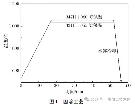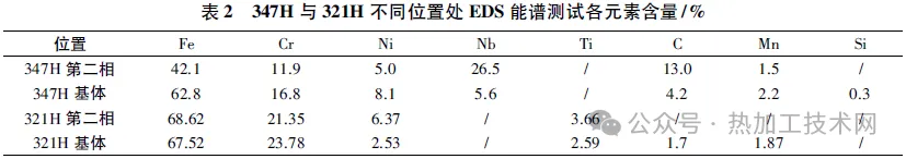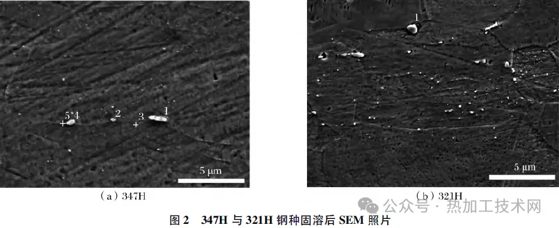 347H与321H不锈钢因具有良好的耐晶间腐蚀、耐高温、抗蠕变性能而广泛应用于航空航天、石油化工等行业。321H不锈钢属Cr-Ni-Ti系不锈钢,Ti添加使基体中第二相主要以TiC形式析出,由于Ti的固碳作用有效抑制Cr23C6析出,有效提升了321H钢种的高温性能和耐晶间腐蚀能力。潘超对321不锈钢中含钛夹杂物析出行为进行研究,发现样品冷却速率对夹杂物析出后尺寸有显著影响,通过水淬冷却TiN夹杂物平均尺寸达到5μm,空冷条件下夹杂物平均尺寸达到6μm,以5℃/min随炉冷却则夹杂物平均尺寸增加至7μm,5μm以上夹杂物较水淬冷却的不足1%增加至80%。Y Li等以SUS321中奥氏体晶粒尺寸为出发点,对马氏体起始转变温度和相变路径进行研究,结果显示,当奥氏体晶粒尺寸增加时,Ms点随之增加,层错能减小;当奥氏体晶粒尺寸<3.5μm时,奥氏体向马氏体转变过程逐渐被抑制。347H不锈钢则属于Cr-Ni-Nb系奥氏体不锈钢,由于Nb的添加使得其具有良好的耐晶间腐蚀以及高温组织稳定性,并随着聚焦式太阳能热发电技术的应用,347H作为熔盐储罐用钢受到广泛关注。SR Akanda等对347H钢种超临界CO2动力循环降解过程中材料厚度( 2.54mm与0.6mm) 的影响进行了研究,研究表明较厚规格347H钢种表面形成完整的保护性氧化膜,最大限度保护基体不被腐蚀。 本研究将固溶处理后的347H与321H钢种进行对比分析,从第二相分布与宏观力学性能的角度观察Nb和Ti两种添加元素对奥氏体不锈钢材料性能的影响,为工程实践提供理论依据和数据支撑。